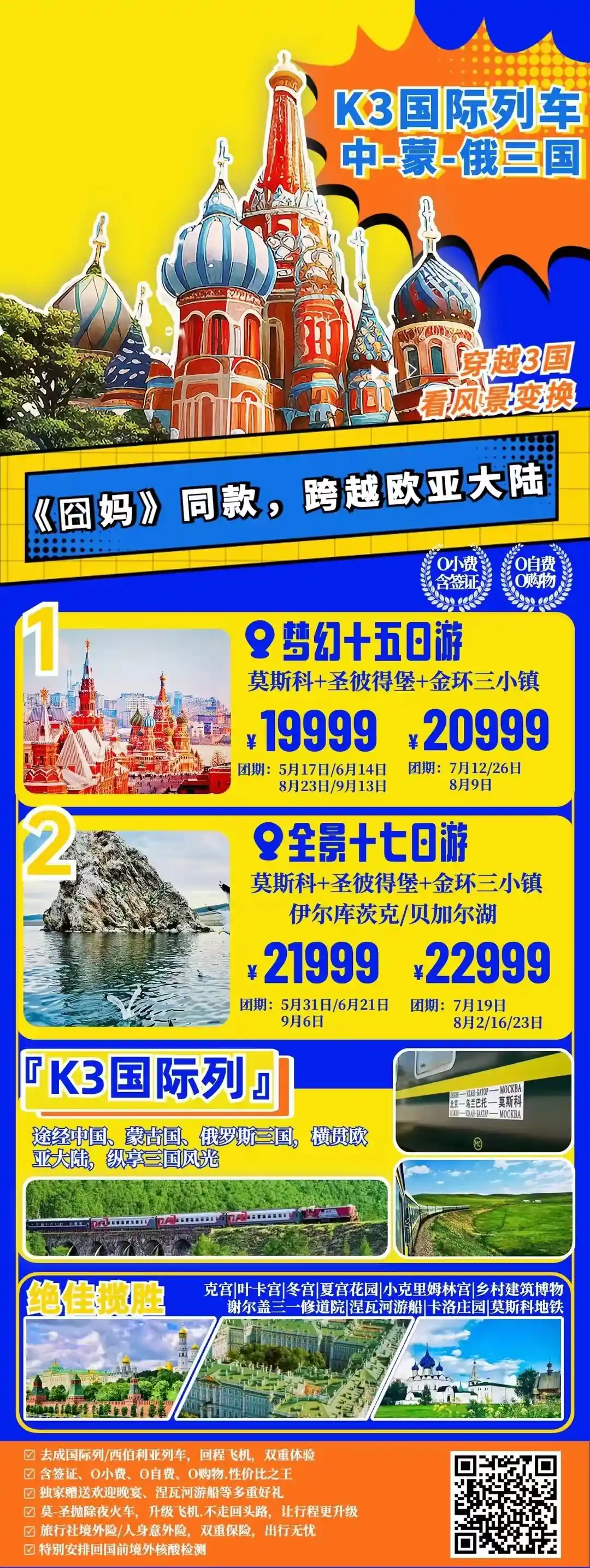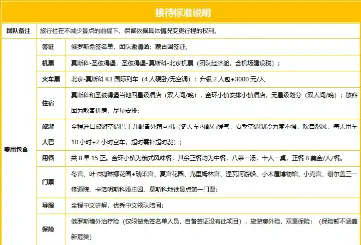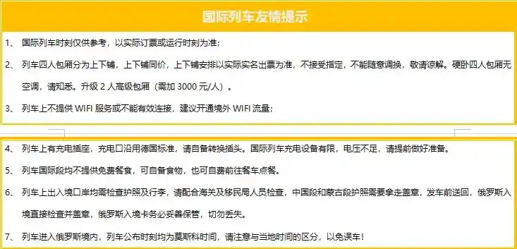 住宿升级:7 晚四星级酒店住宿 +1晚金环小镇特色民宿+5 晚K3 次国际列车住宿,四人硬卧(无空调)或升级2 人高级包厢(需加3000元/人,含服务费)!