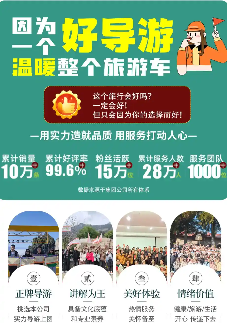 4)导游:为您服务的是专线导游。参团游客在景区游览速度快慢不一,请尽量跟随导游步伐一起游览,导游会在抵达景区前介绍该景点游览内容及游览路线,务必按导游约定的时间、地点集合;