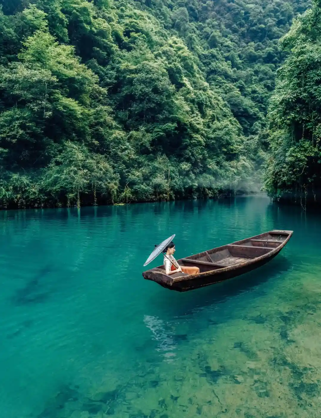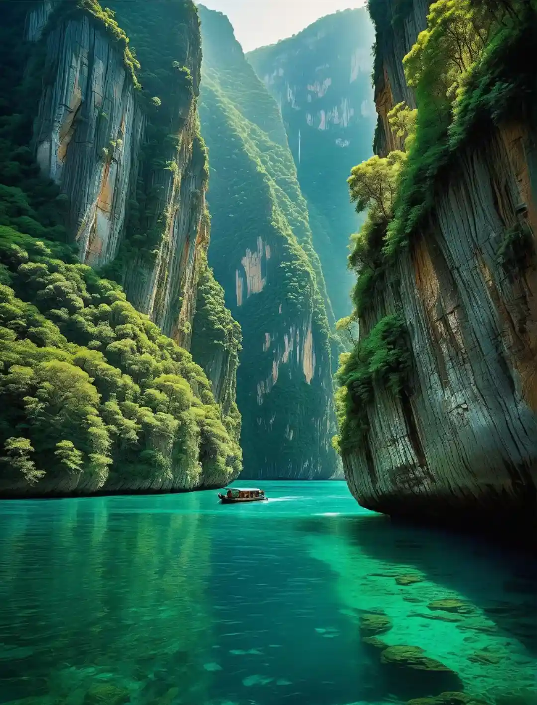 屏山峡谷亦被誉为中国的"仙本那",宝石般的湖水,清澈见底,船只滑行于上,犹如漂浮于太空,山谷的裂缝中照进来束束阳光,让人瞬间犹如在画中一样,特别是正午时分阳光直射入峡谷,清澈的河水会倒映出船的倒影,宛若悬浮。