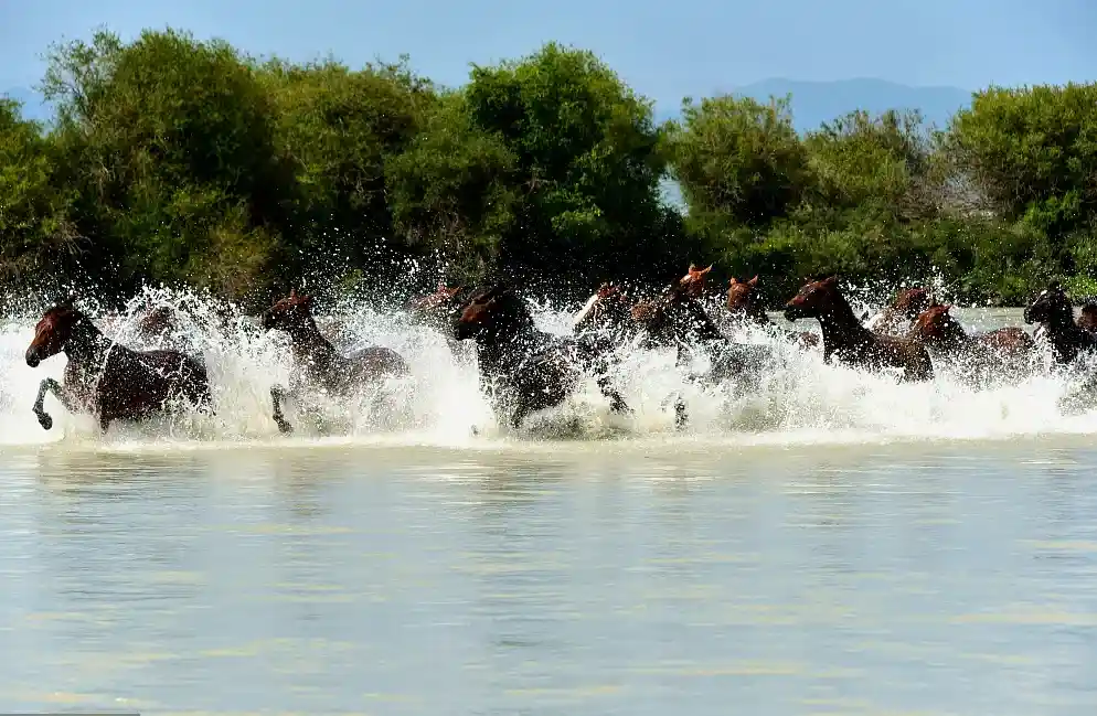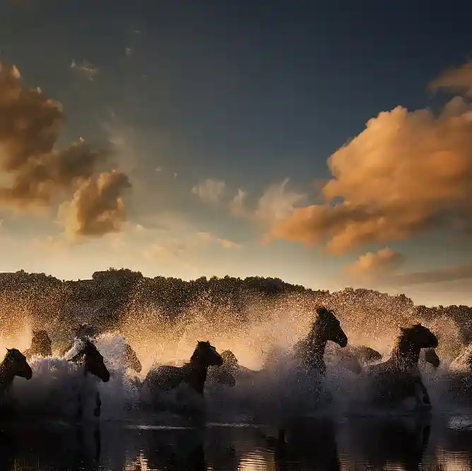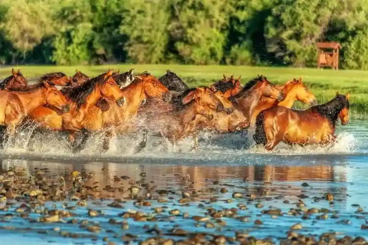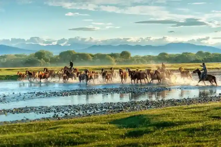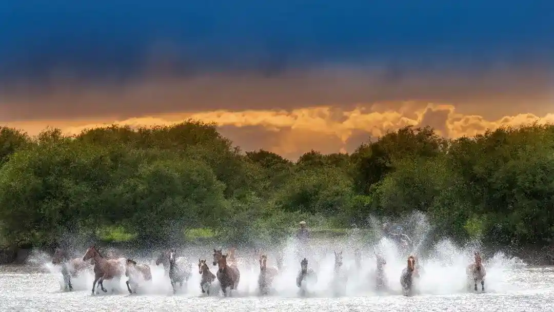一群骏马在河水中奔驰,背景是蓝天白云,还有一望无际的草原
