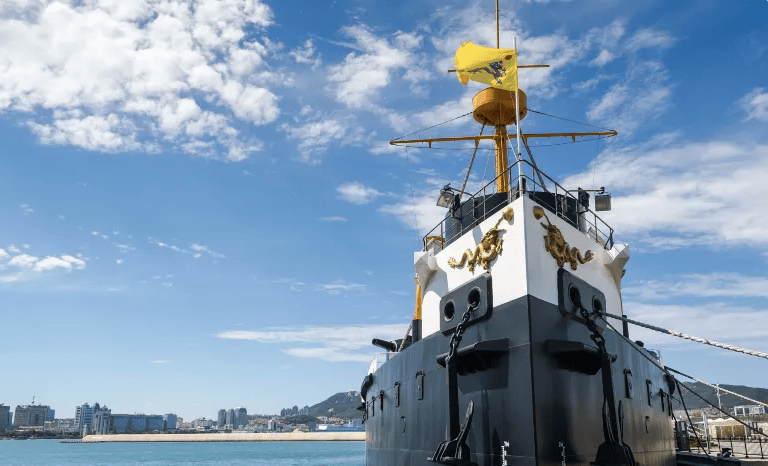 码头乘客船赴刘公岛,刘公岛位于威海湾口,是少有的海上公园。岛上主要景点有:刘公岛国家森林公园、刘公岛博览园、刘公岛鲸馆、旗顶山炮台等。定远舰,这艘军舰又因浓浓的甲午风云和在甲午海战中的不屈表现,赢得了“永不沉没的‘定远’”之称,成为国人心目中的一座海上图腾。