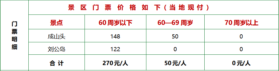 √ 【小贴士】因不可抗力因素、大风、大雾等天气原因或军事演习导致无法登刘公岛,届时将替换同等价值景点【5A级华夏城景区】等价对换,无可退无需补费。