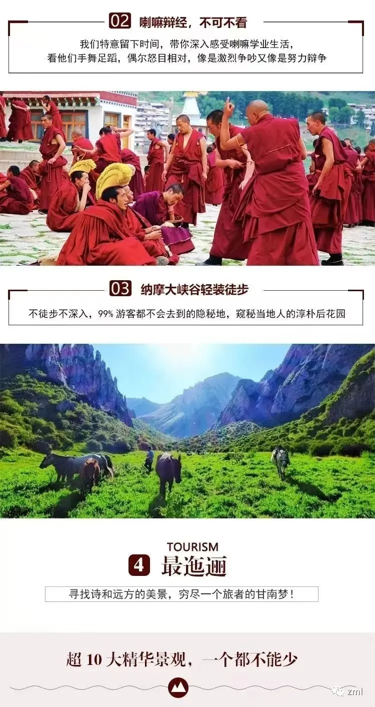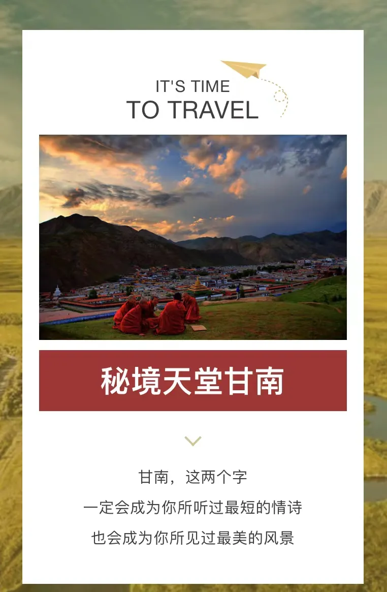 沿着青藏高原向东而去在黄土高原和川西高原之间顺着黄河的方向走进着一片被旅行者长期忽略的独特藏域深度体验这里的美景、人文和你的旅行信仰“不是任何色彩都叫做甘南”甘南是红色的红色的草原霞彩、红色的藏式建筑、庙宇、僧人。甘南是绿色的绿色的草原、森林、绿色的农田、山谷、洮砚。甘南是蓝色的蓝色的天空、湖泊还有蓝色的河流。甘南是白色的白云、白羊、白石崖雪莲花、白哈达、白帐篷。甘南是黄色的黄经轮、黄教僧帽贡唐宝塔、酥油、玛曲黄金。藏区没有的宜人气候甘南却有湖泊、草原、雪山、森林一应俱全还有更多别处没有的体验策马奔腾,徒步密林,多民族的美食。当你来了甘南,你会发现甘南这片神秘又圣洁的土地有着太多太多心灵的震撼。遗世独立的扎尕那山雾弥漫,格尔底寺转经筒上刻着六字真言,充满信仰的人们合手匍匐在路上,禅定寺磕着长头的老者,给人带来心灵的震撼甘南我来了!