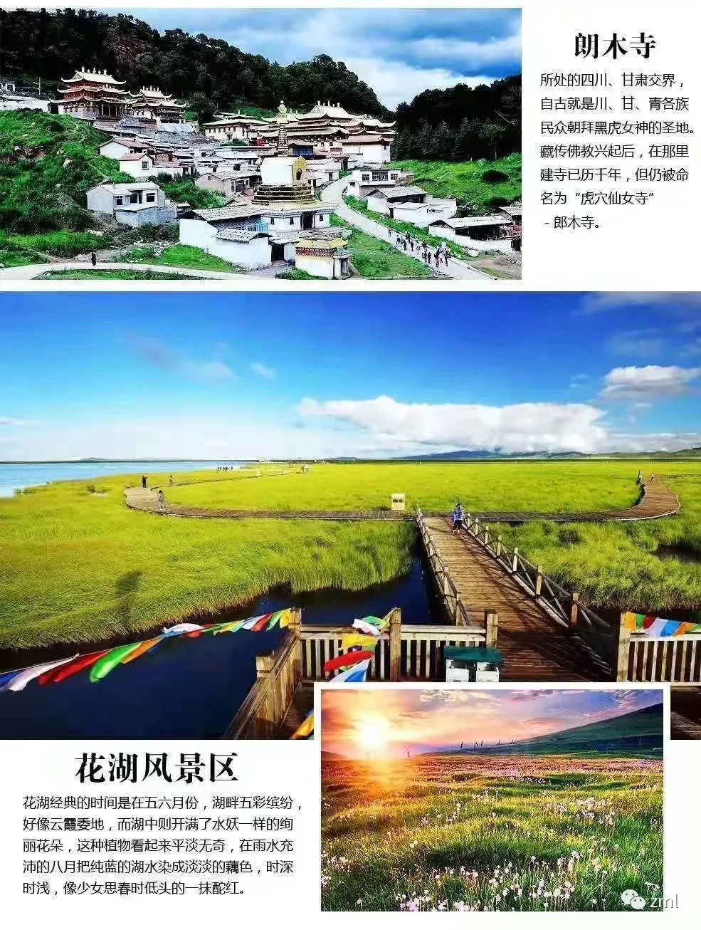 后乘车前往——【花湖】景区参观游览(约3小时)花湖位于四川若尔盖和甘肃郎木寺之间的213国道旁,是热尔大坝草原上的一个天然海子。热尔大坝是我国仅次于呼伦贝尔大草原的第二大草原,海拔3468米。若热尔大坝上有3个相邻的海子,最小的叫错尔干,最大的叫错热哈,花湖是居中的一个。花湖四周数百亩水草地就是高原湿地生物多样性自然保护区。简单,安静,却让人燃烧,这就是花湖,妖娆的花湖。花湖很大,镶嵌在浩原沃野、广袤无垠的若尔盖县热尔大坝草原中间,如明珠般耀眼。花湖很美,美中三绝——珍禽、闪电和彩虹。晴天时蓝天、白云、碧草、野花、珍禽相映成趣;雷雨交加时,闪电金光闪烁,横行天空,在天为利刃,掷地为火球。而在阴云密雨覆盖之外则会映现出瑰丽的彩虹,在辽阔的草原,美丽的花湖,出现“东边日出西边雨”的意境不是传奇。天上的彩虹映入水里,更是美不胜收。会让你体会“曾经沧海难为水,除去巫山不是云”的意境......后驱车40分钟赴郎木寺镇入住