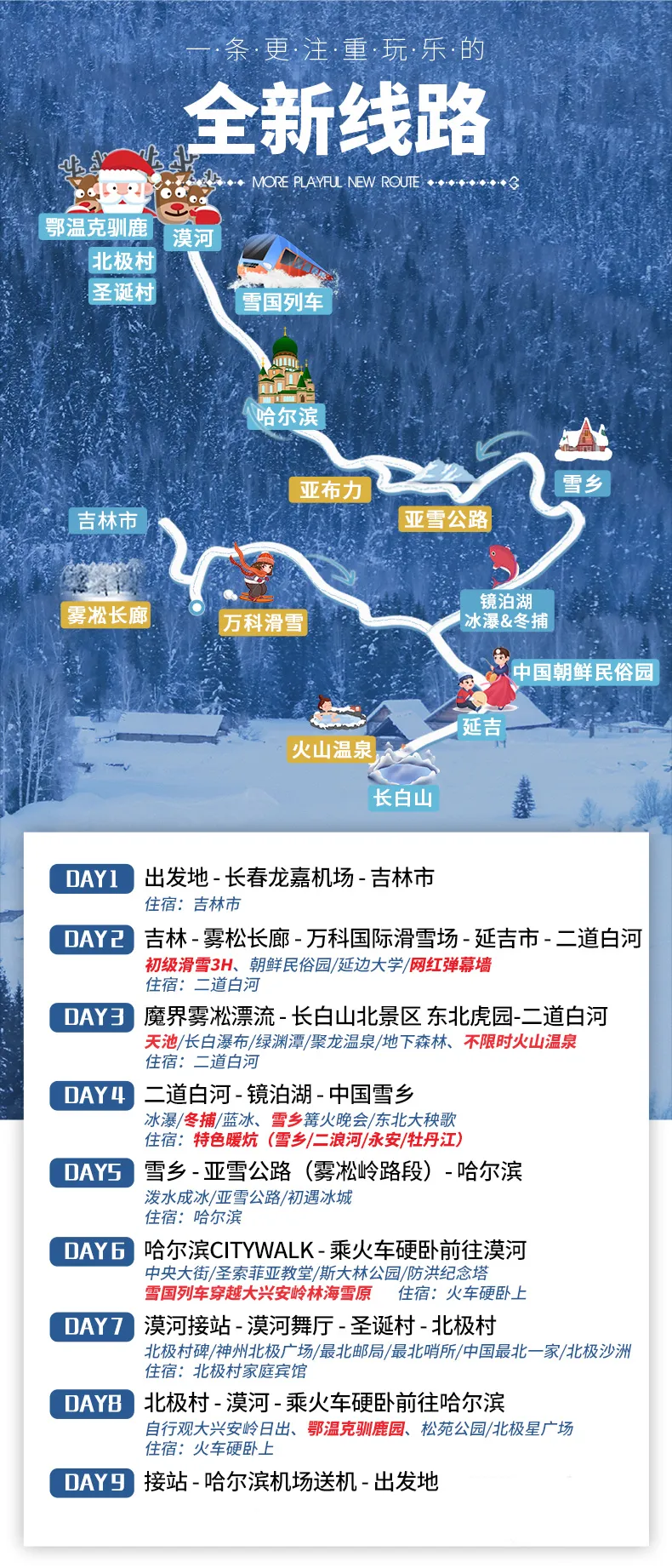【冰雪大满贯】冬季无遗憾!吉林/延吉/长白山/雪乡/哈尔滨/漠河北极村,住4-5钻酒店,温泉滑雪·雾凇漂流·圣诞老人