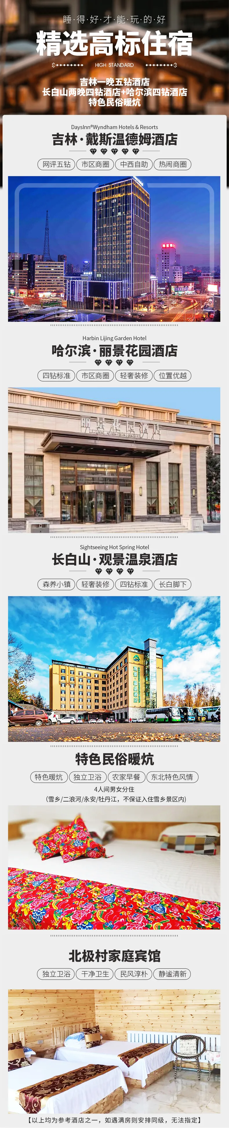 用房 吉林五钻+二道白河四钻酒店+哈尔滨四钻+特色民俗炕+北极村家庭宾馆(以下为参考酒店,排名不分先后,具体以我社安排为准,不可指定,敬请谅解。)