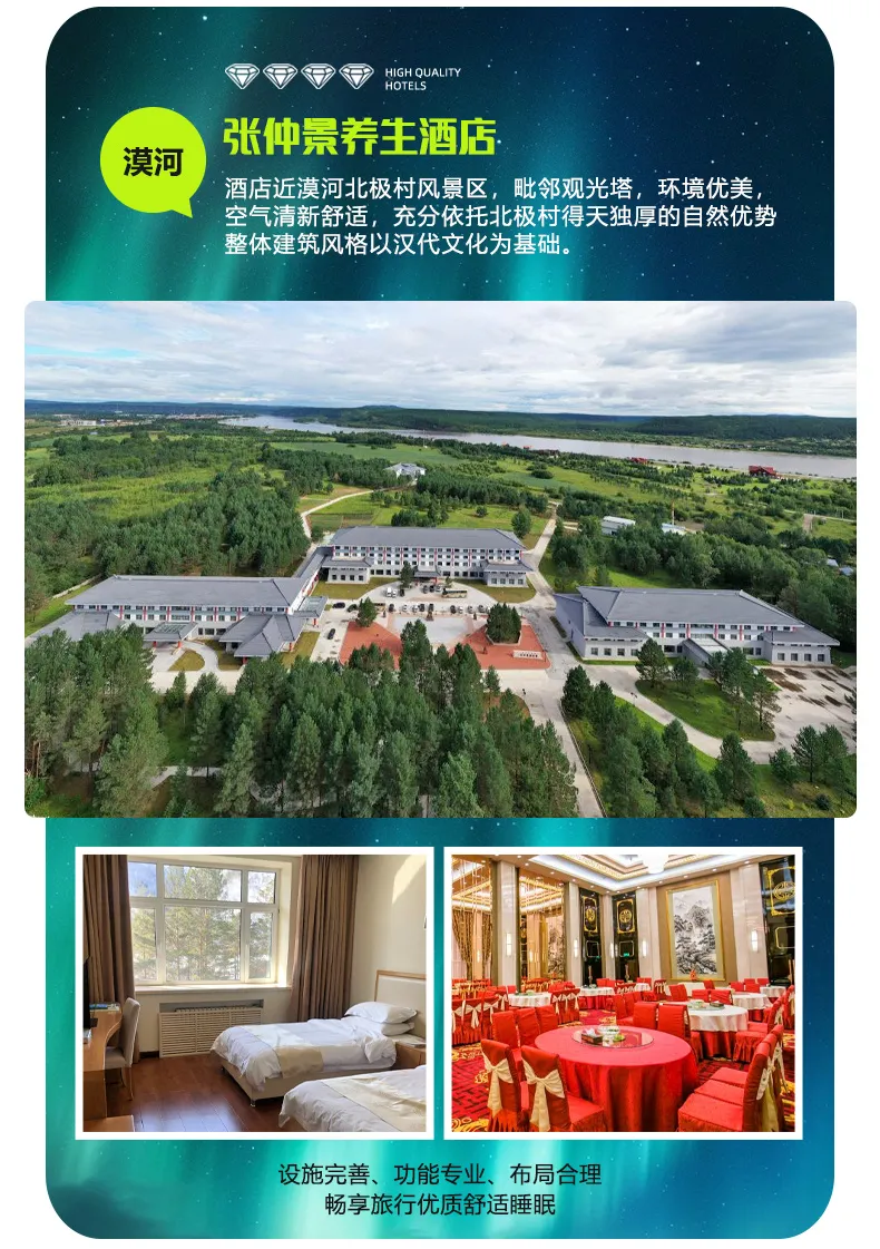 北极村参考携程四钻酒店:张仲景养生酒店、蓝孔雀酒店、北极山庄、翅翼酒店或同级