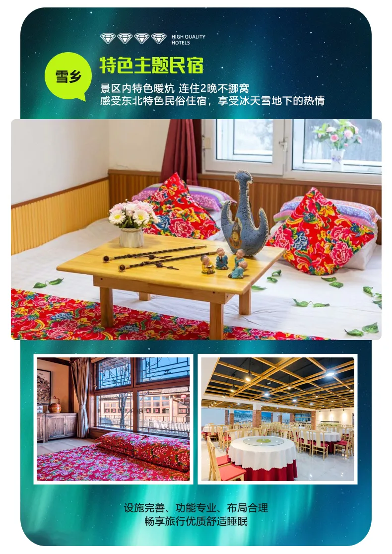 3. 用餐: 4早1落地早9正餐 30/人(酒店含早不吃不退,不占床无早餐,十人一桌,八菜一汤,酒水自理,不足十人菜品酌减,敬请谅解;雪乡为民宿围桌早餐)