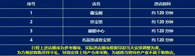 8.为方便游客购买伴手礼,特别安排土特产仓库采购,为越南当地特色产业不属于购物店。