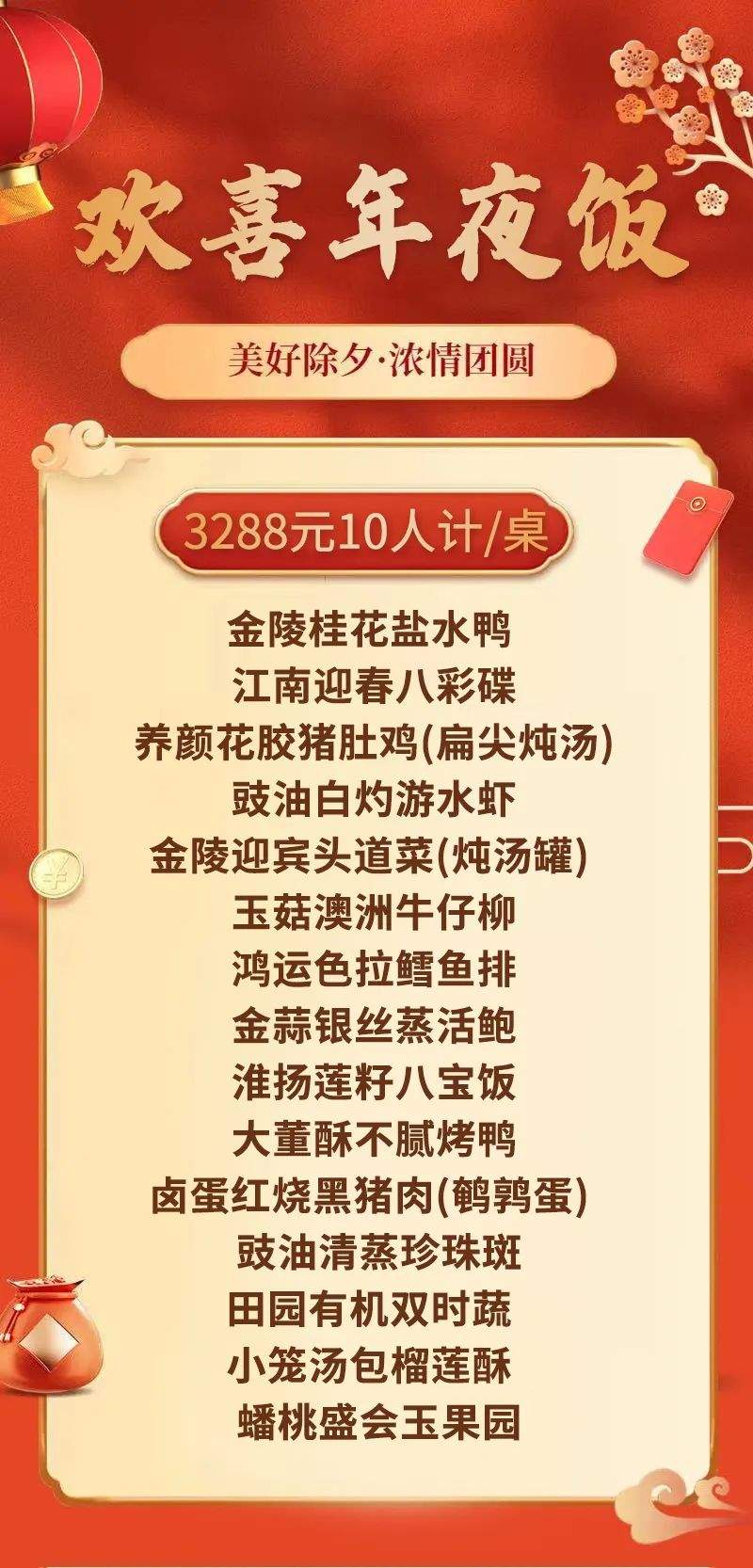 晚餐享用价值3288元/桌10人计/桌年夜饭(自带酒水需支付服务费)