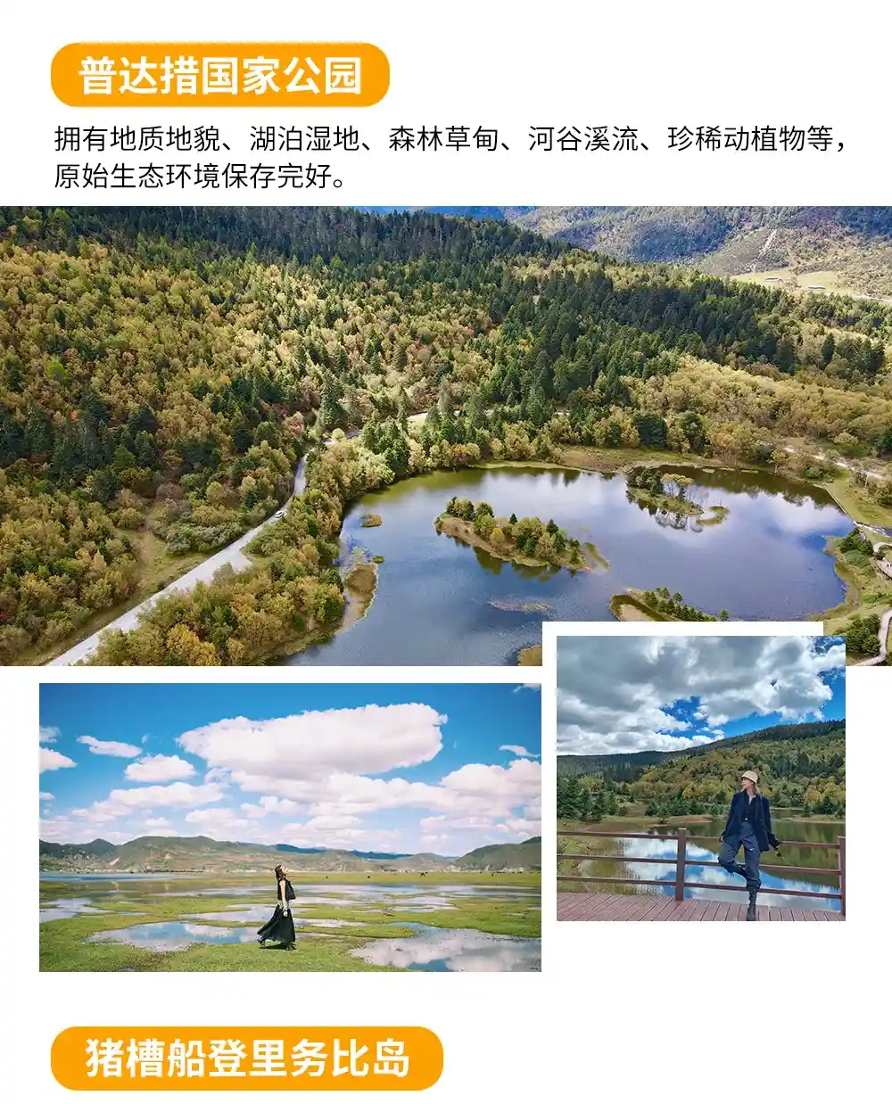 后途经【彝族村寨】,直达市区前往【普达措国家森林公园】普达措国家公园是一个无任何污染的童话世界,湖清清,天湛蓝,林涛载水声,鸟语伴花香,一年四季景色各不相同。漫游花海草甸,走进森林成毡的净土,赏雪域高原上的美丽湖泊属都湖,观赏茂密原始森林。
