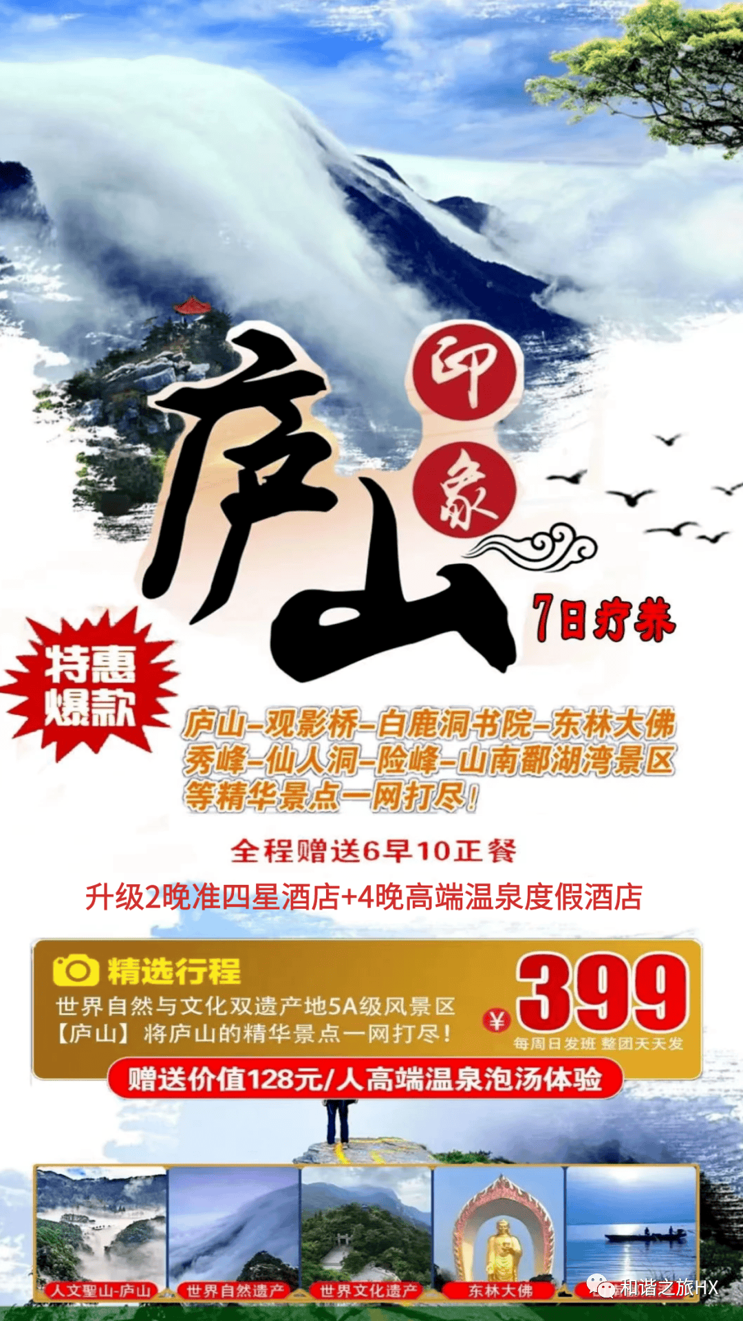 特惠爆款【399庐山温泉度假7日游】升级2晚准四酒店+四晚高端温泉酒店6早10正餐餐12菜•赠送景德镇瓷器一套