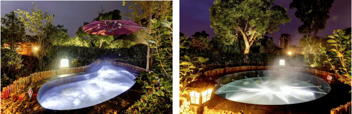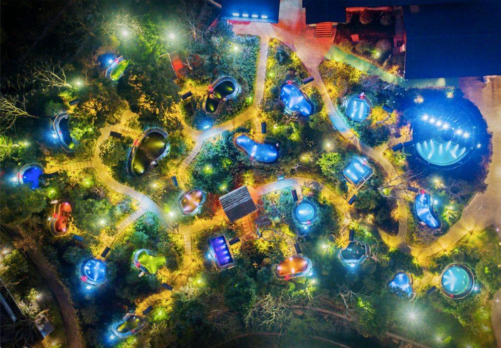共计拥有儿童互动池、漩涡池、涌泉池、按摩池、鱼疗池、原汤池、牛奶池、花瓣池、名木汤池、精油池等22个露天泡池,泡池旁的小木屋则是综合休闲区,提供休憩、生态茶食、养生SPA、影音空间等项目。