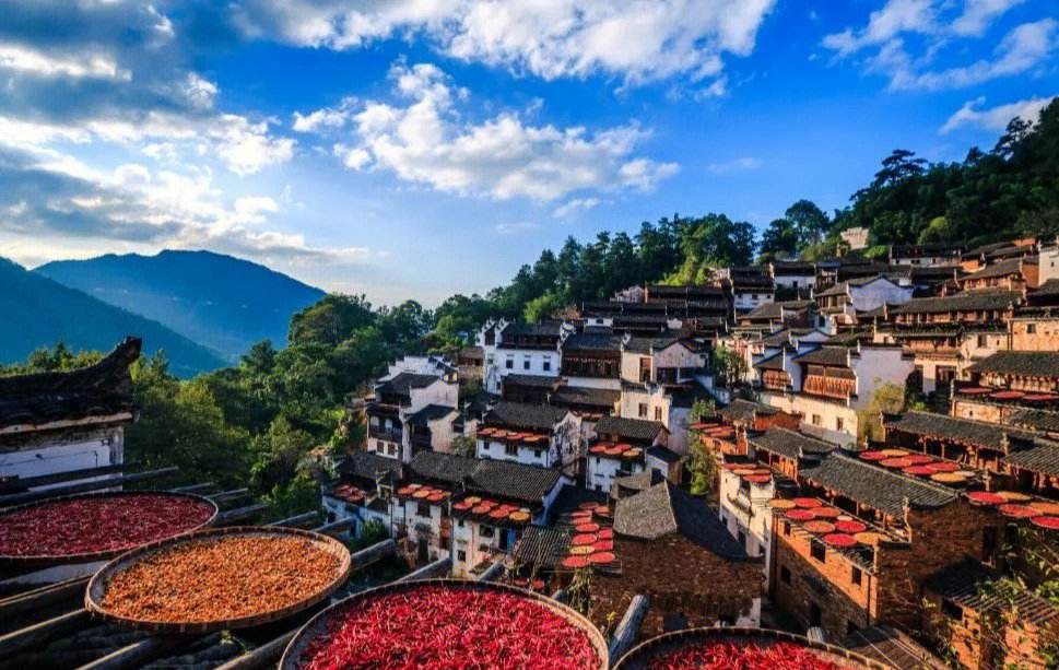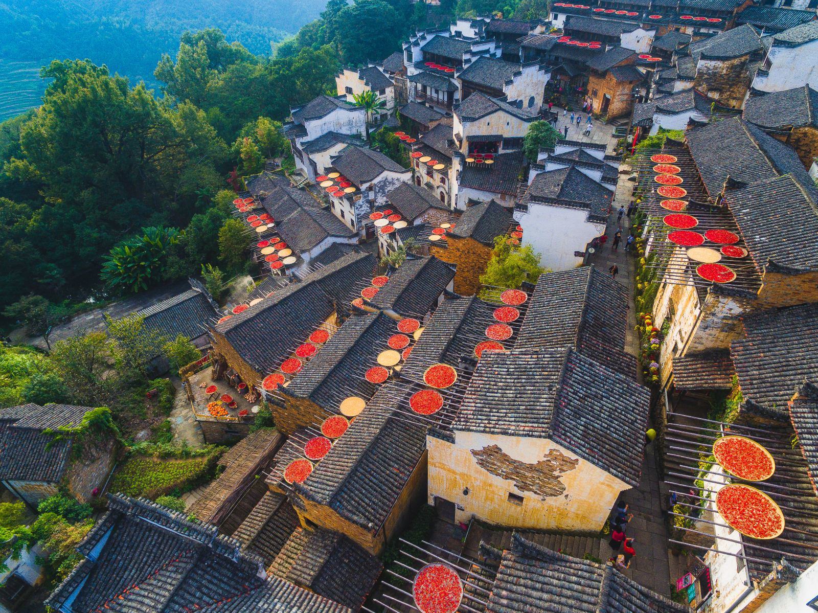 篁岭是婺源东线上一个典型的山居村落,当地村民自古就有用竹晒匾晾晒农作物的习俗。每到丰收时节,阳光下数百栋错落的徽派民居,和晒架上五彩缤纷的丰收成果构成绚烂的“晒秋”景观,吸引了不少摄影师来此取景创作。