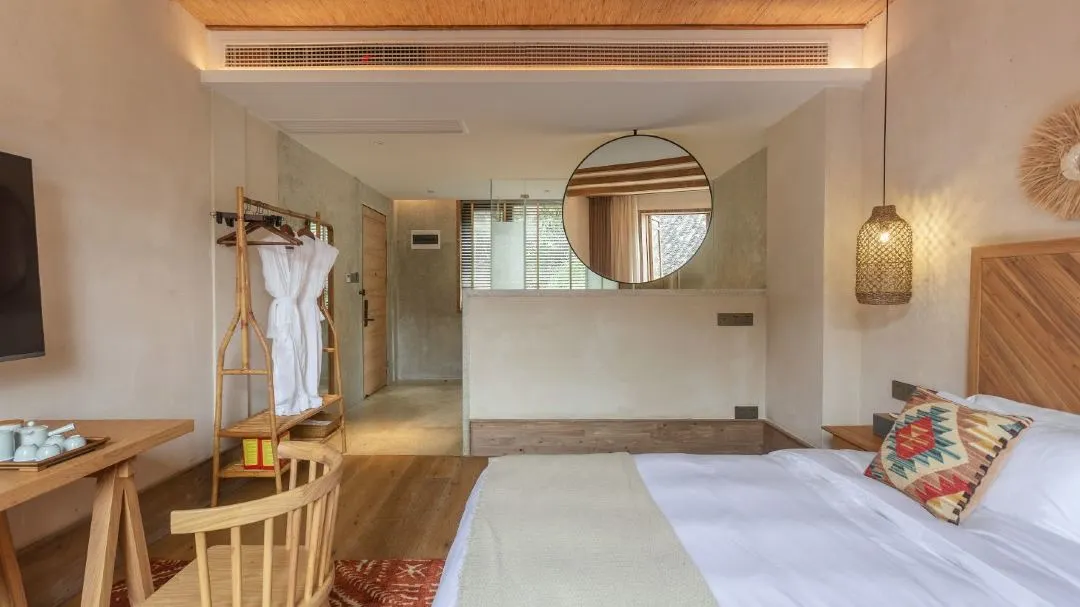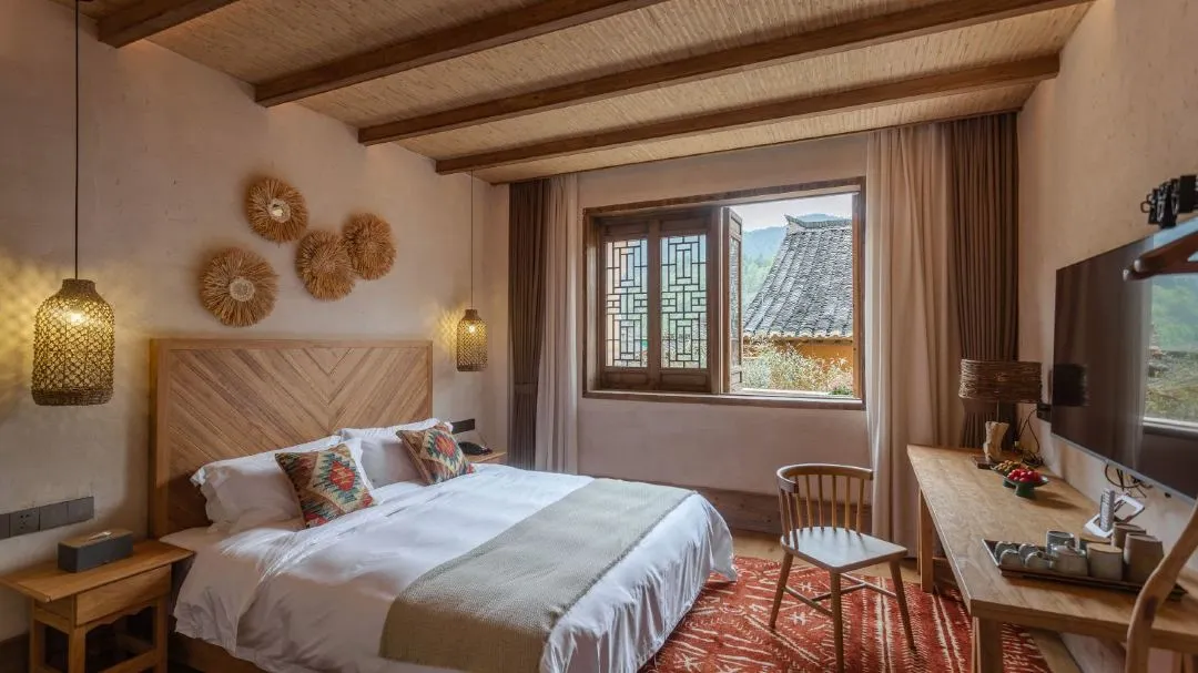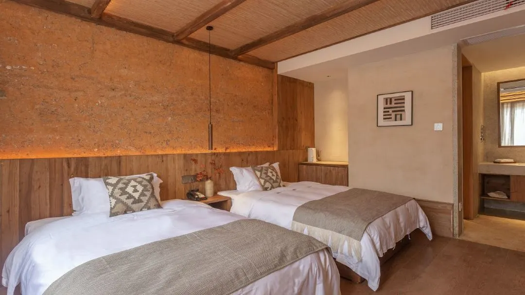 望仙谷仙宿-位于望仙谷景区内灵光街。民宿的建造方式回归传统:采用当地传统的建筑工法,特殊土质夯制的墙面,冬暖夏凉,以黄土黑瓦作为主色调,让屋子和山融为一色,让色和景交于一体。仙宿所有内墙都采用硅藻泥材料,美观环保,质朴大方;每个房间都装有地暖和中央空调,无论寒冬或是夏日,都能给你舒适的居住体验。仙宿以简约自然古朴的设计手法构筑空间,每个房间的设计和布局都不尽相同,在这里,没有两间一样的房间:有的阳台可以一览群山,有的浴缸可以仰望星空,有的更具娱乐功能,有的更亲子温馨……每间房的装修和摆设都各有所异,没有过多浮夸的装潢,更多的是一种放松的舒适感。