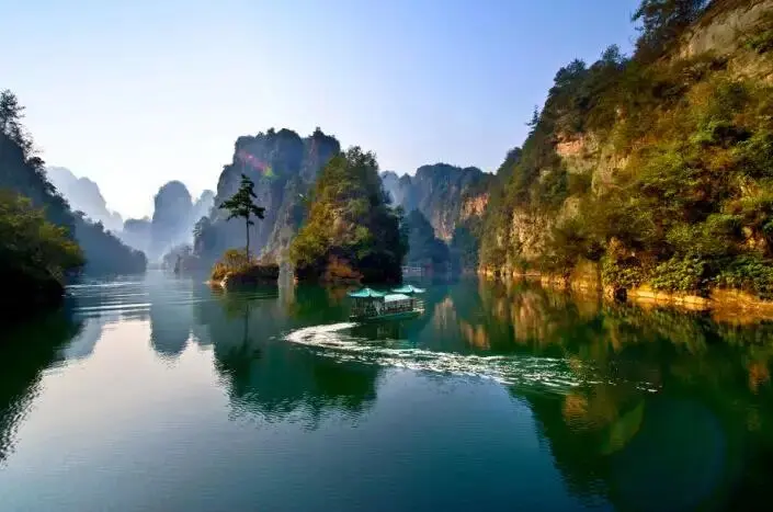 游览【宝峰湖】(门票已含,赠送环保车和游船):被称为“世界湖泊经典”,2011年被评为中国十大度假休闲湖泊之一,地处张家界武陵源风景名胜区的核心地带,宝峰湖风景区集山水于一体,融民俗风情于一身,尤以奇秀的高峡平湖绝景、“飞流直下三千尺”的宝峰飞瀑闻名中外游客,山歌不断,著名景点有仙女照镜,金蟾含月等景点,融合美好的山水自然风光。