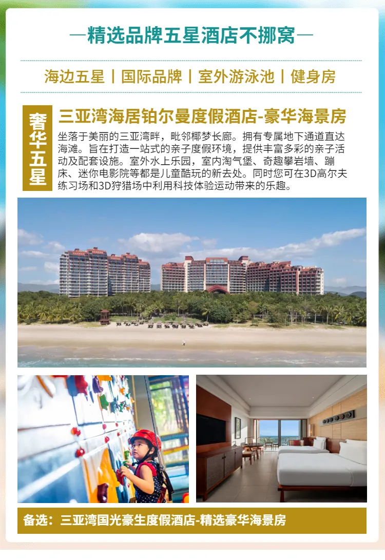全程指定入住酒店双标间/含早;产生自然单房的需补房差;全程如需大床房提前告知。 全程入住国际五星品牌酒店: 三亚湾海居铂尔曼度假酒店——豪华海景房 备选酒店: 三亚湾国光豪生度假酒店-精选豪华海景房或同级酒店 说明:海南酒店多为旅游度假酒店,标准较内地偏低。如旺季等特殊情况,因房源紧张,将安排不低于以上酒店档次的酒店。 |