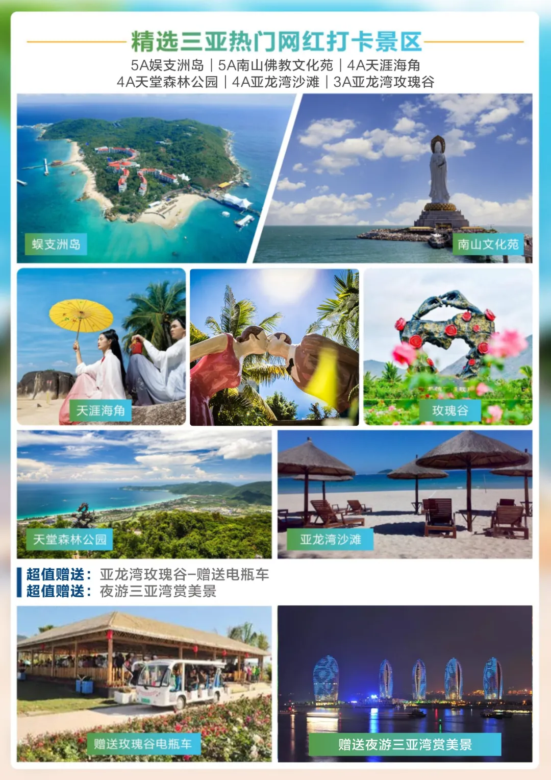 优选热门景区: 5A蜈支洲岛、5A南山文化苑、4A天涯海角、 4A亚龙湾热带天堂森林公园、亚龙湾沙滩、 3A亚龙湾玫瑰谷