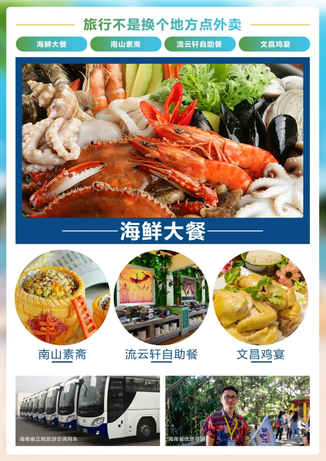 全程含4正4早,早餐:酒店中式自助早(酒店含早,不用不退),正餐:平均餐标40元/人/餐标准。 特色餐:海鲜风味餐/文昌鸡宴/流云轩自助餐/南山素斋。 |