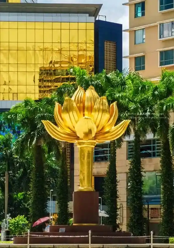 金莲花广场是澳门回归祖国时由中国国务院赠送的大型铸铜贴金雕塑“盛世 莲花”。