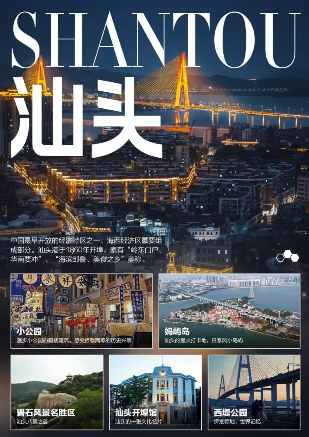 【汕头小公园】‘华人春节联欢晚会分会场’,汕头市“百载商埠”的历史见证,其基本仿造巴黎街区样式的独具一格的环形放射状路网结构、中西合璧的骑楼建筑群,是富有魅力的城市个性和地方文化的重要遗产。小公园的潮汕文化、海洋文化、华侨文化、商业文化、建筑文化在这里融合汇聚、相得益彰,修复活化这片“精神家园”成为众多潮人共同的梦想,百载商埠重现迷人风采!晚上灯火阑珊,让人仿佛置身于“上海的外滩”。