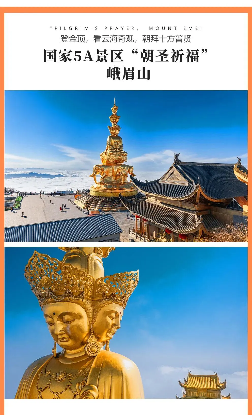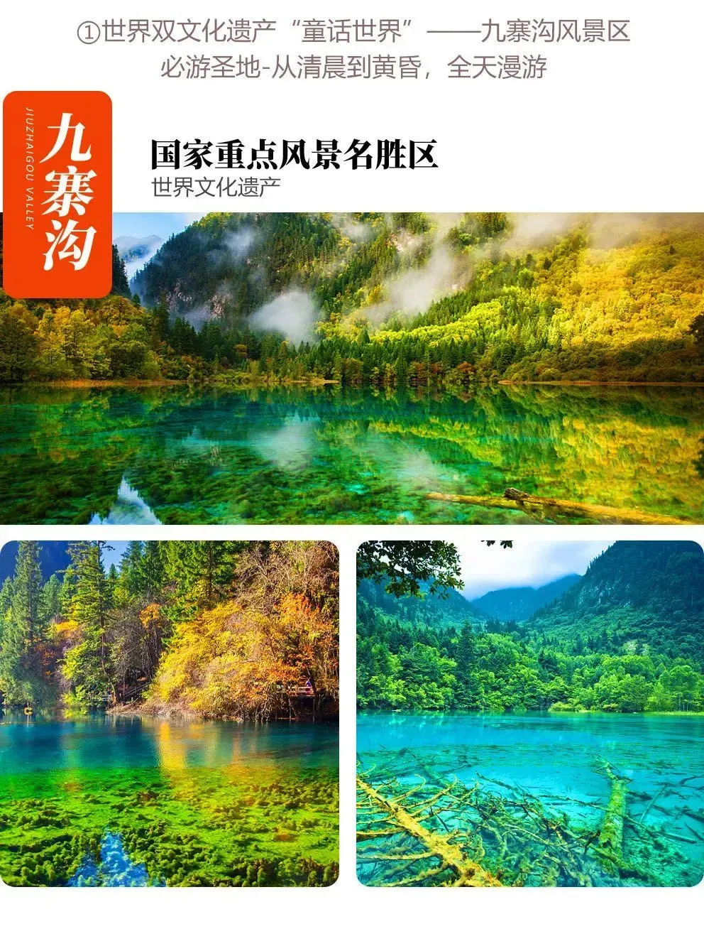 💎5大5A:九寨沟风景区+黄龙风景区+都江堰+峨眉山金顶+乐山大佛+黄龙溪古镇+成都;