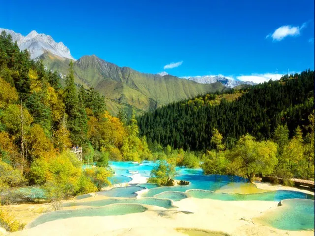 川主寺午餐【牦牛煲汤锅】,后前往黄龙景区,步行或可另付费乘坐黄龙上行索道游览人间瑶池—【黄龙风景区】(含:景区大门票;不含观光车20元,上行索道80元(建议乘坐)下行索道40元,景区强制险10元/人请自理)(游览约4小时):游览迎宾彩池、飞瀑流辉、金沙铺地、争艳彩池、五彩池……聆听黄龙古老的传说。游览完毕,乘车前行,经松潘古城,翻越叠溪海子,抵达茂县/松潘,后入住酒店休息。