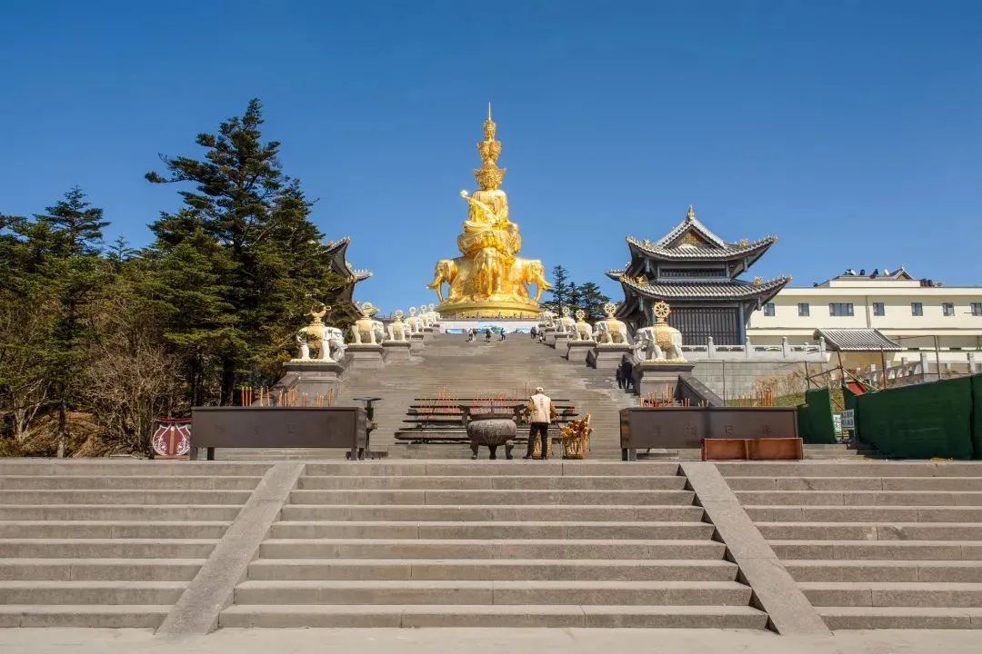 早餐后前往AAAAA【峨眉山景区】峨眉山是普贤菩萨的道场 ,宗教文化特别是佛教文化构成了峨眉山历史文化的主体,所有的建筑、造像、法器以及礼仪、音乐、绘画等都展示出宗教文化的浓郁气息。山上多古迹、寺庙,有报国寺、伏虎寺、洗象池、龙门洞、舍身崖、峨眉佛光等胜迹,是中国旅游、休养、避暑目的地之一,(含大门票;不含观光车90元必须产生)取门票换乘观光车抵达峨眉山雷洞坪步行 1.5 公里至接引殿,可步行或乘索道(费用上行65元,下行55元,往返保险5元+5元+猴区保险5元+耳麦讲解器20元自理)至【峨眉金顶风景区】,游览峨眉山金顶部分,体验峨眉山“一山有四季,十里不同天”的自然景色。前往接引殿(步行时间约30分钟),景区配套提供另付费索道或步行前往峨眉山金顶(游览时间约1小时)。参观金殿、银殿、铜殿。在全世界最大的礼佛广场朝拜48米高的10方普贤。的在舍身崖俯瞰川西平原的优美风光,领阅一览众多山小风光无限好的意境,充分感受峨眉“雄、秀、奇、险、幽”的五大特色。之后沿原路返回雷洞坪享用午餐。品味峨眉当地特色美食。用餐结束后乘观光车至峨眉山脚下,集合乘车前往酒店入住休息。