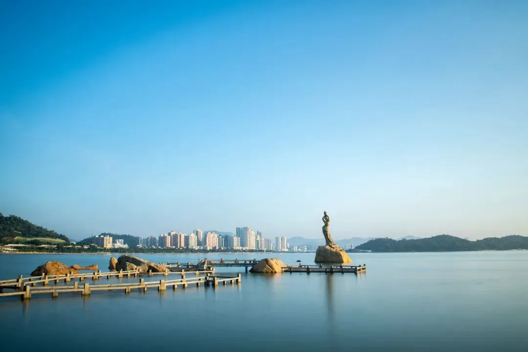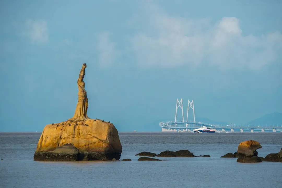 早餐后,前往游览风景秀丽的【香炉湾畔】,这里矗立着一尊巨型石雕——【珠海渔女像】、【情侣路】(游览约30分钟),她领戴项珠,身掮鱼网,裤脚轻挽,双手高高擎举一颗晶莹璀璨的珍珠,带着喜悦而又含羞的神情,向世界昭示着光明,向人类奉献珍宝。渔女石雕高8.7米,重量10吨,用花岗岩石分70件组合而成,是中国著名雕塑家潘鹤的杰作。