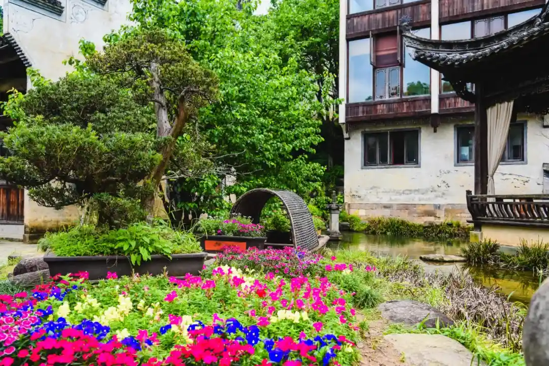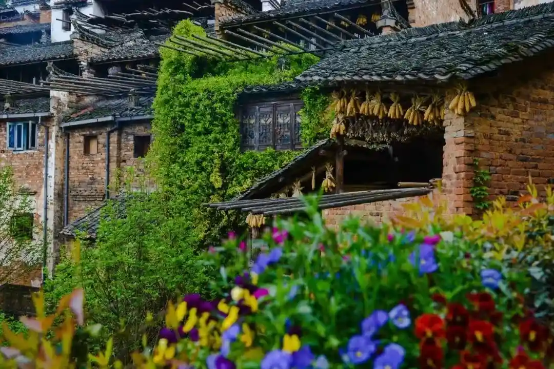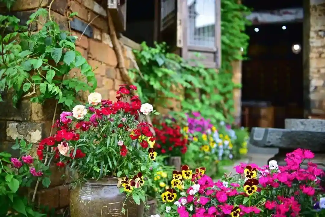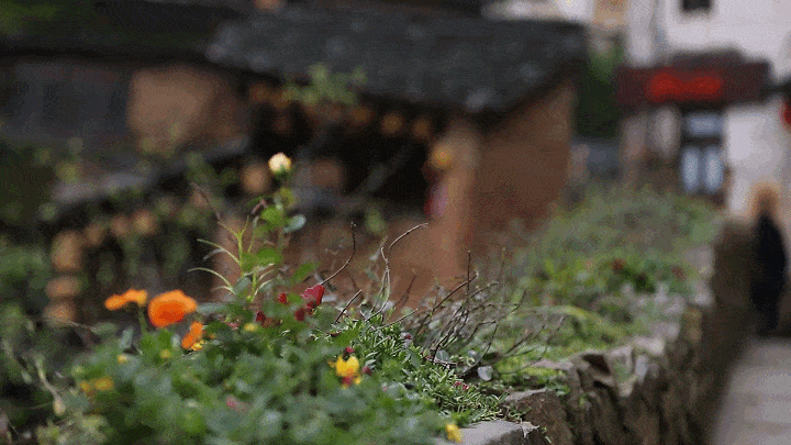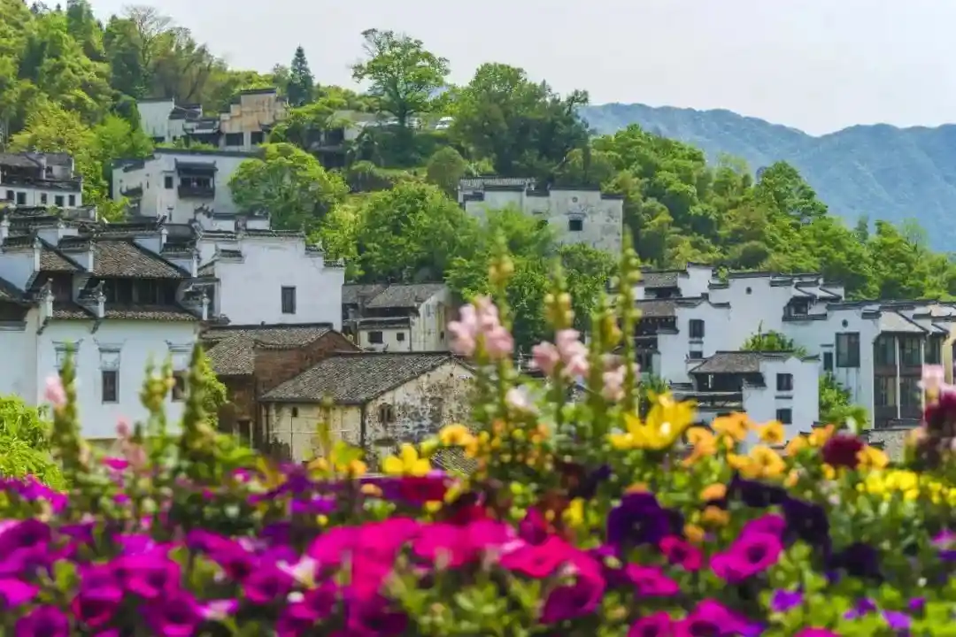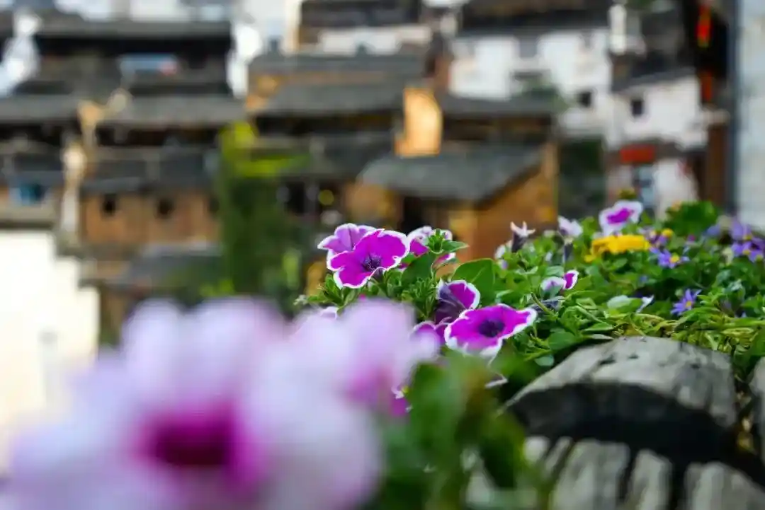 五彩的鲜花将水墨画般的徽派古建串联了起来