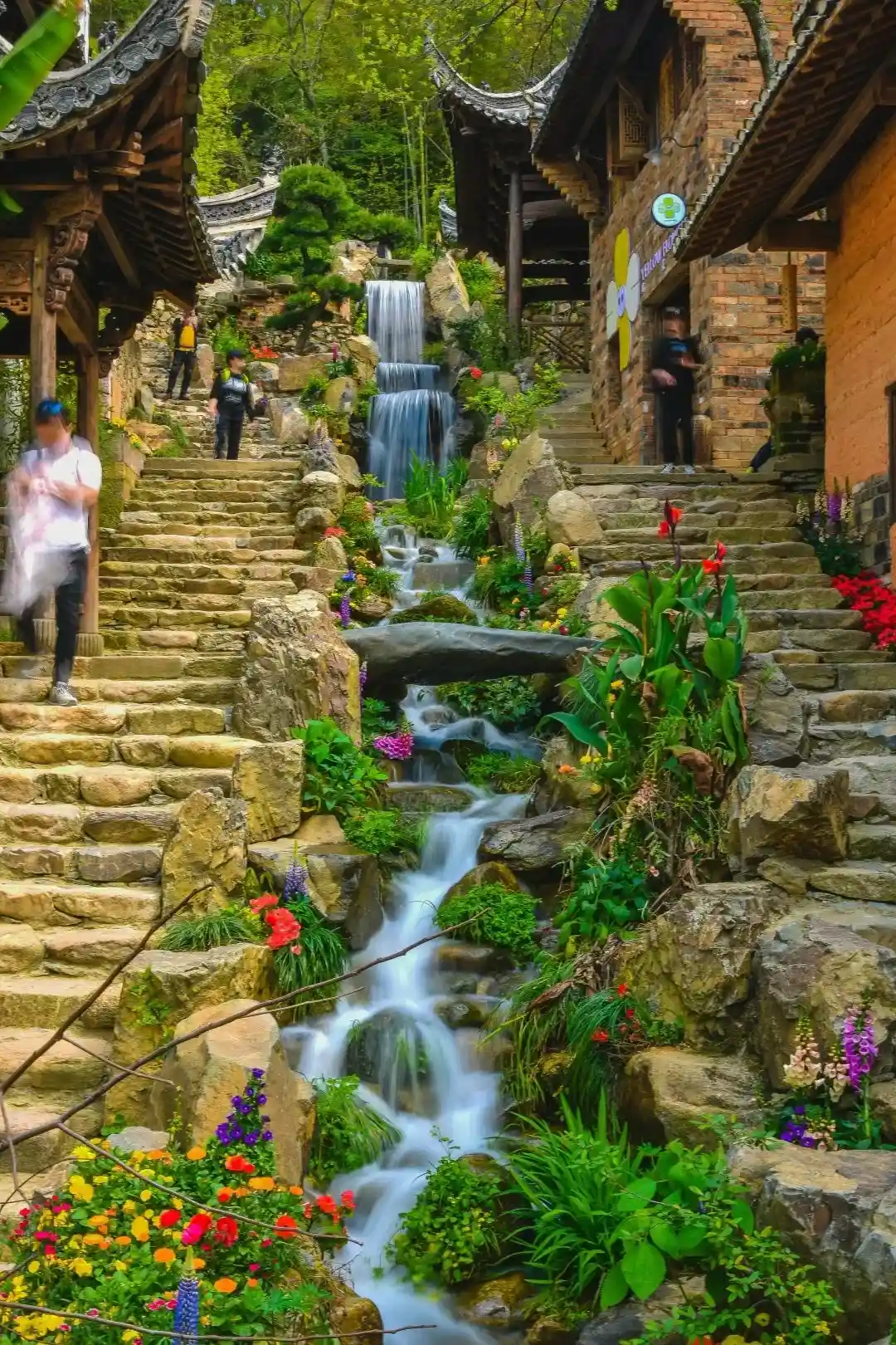 篁岭的花溪水街被各种植物和鲜花覆盖