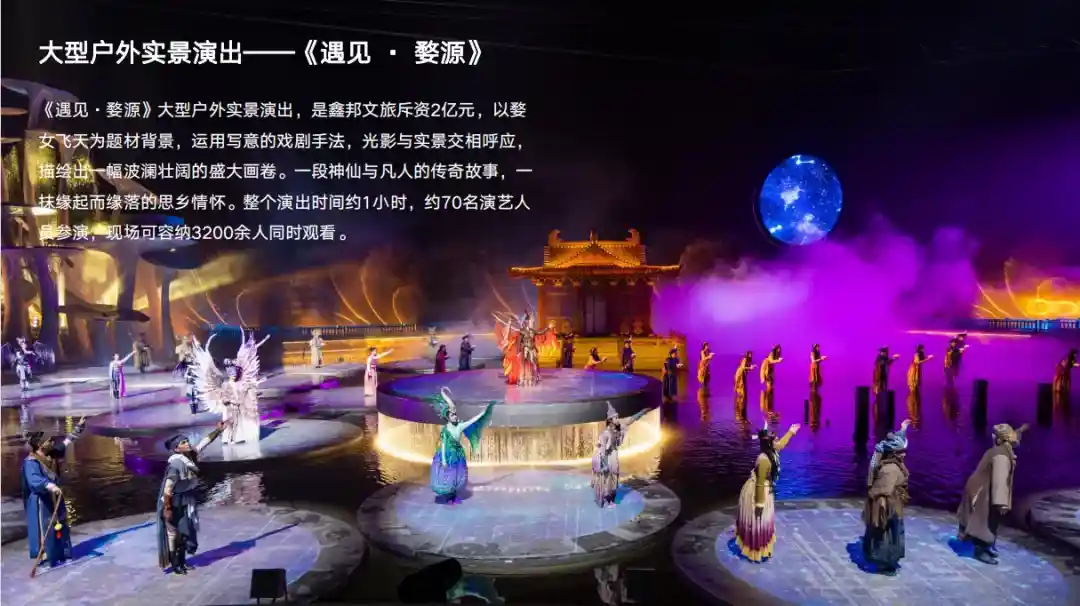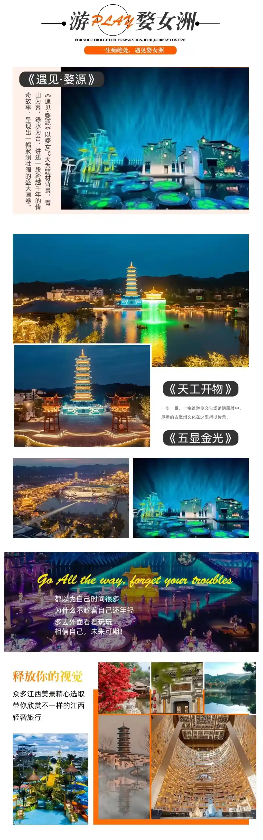 晚上赠送观看《遇见·婺源》(赠送项目,不去不退)大型户外实景演出,婺女洲度假区来源于美丽的“婺女飞天”传说,传承古徽州徽派文化,以婺女飞天、五显财神两大本地文化故事为支撑,运用理学、徽商、非遗等多元文化致力于构建中国新式徽艺度假生活目的地,旨在为来自全球各地的游客呈现一处极具徽州特色的文艺小镇,深度体验“骨子里的徽州”故事。