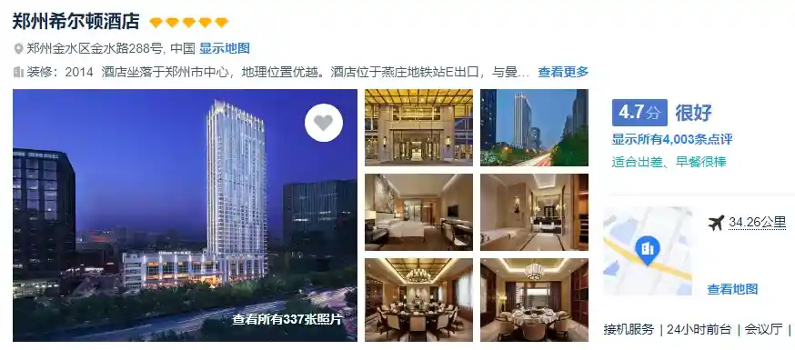 郑州国际五星:希尔顿酒店