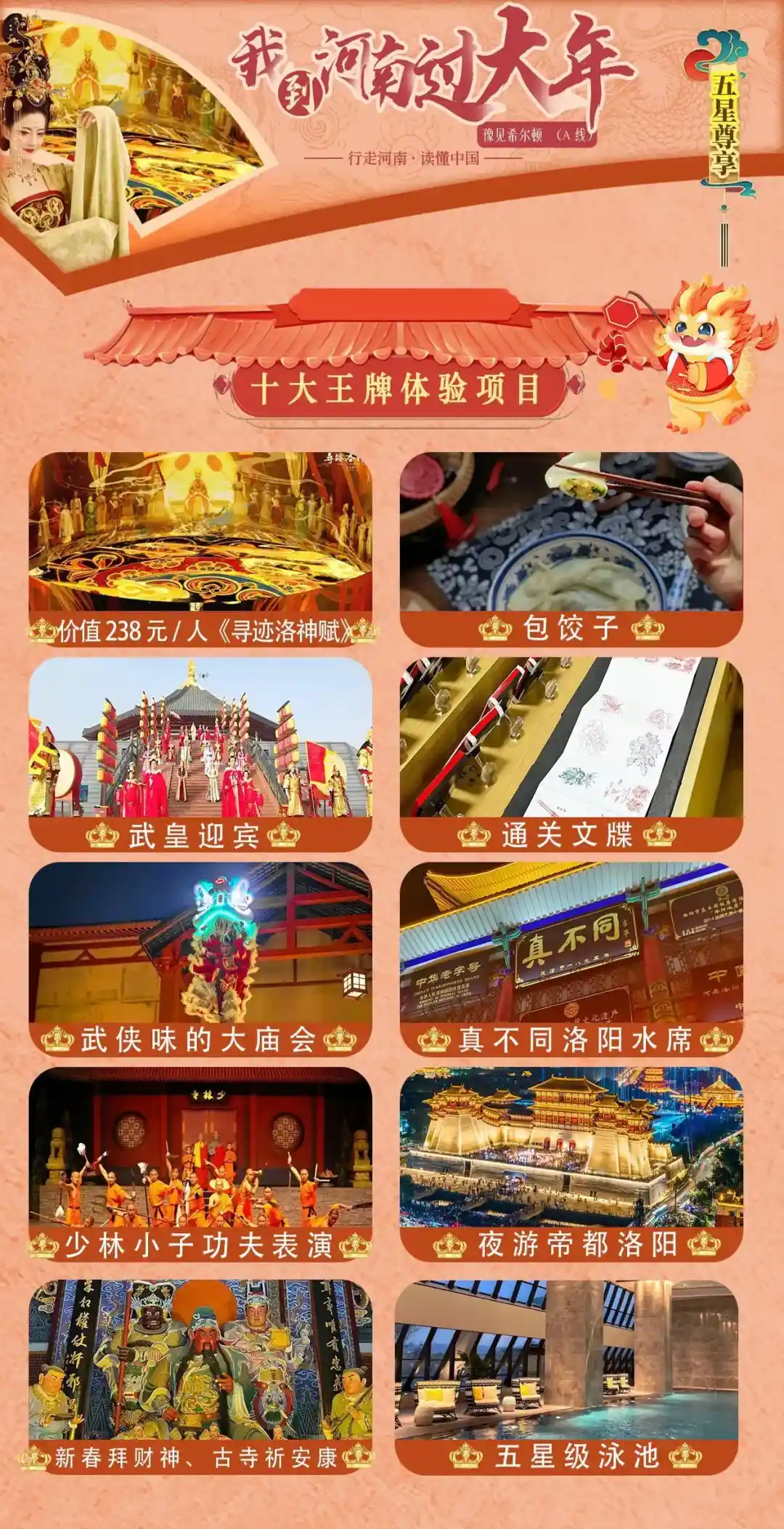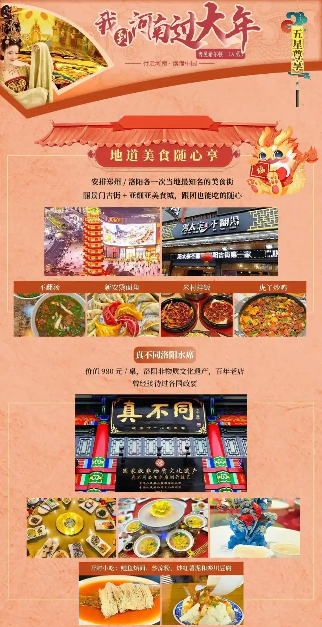 团队用餐:酒店含早,5正餐,用餐标准:40元标准餐,其中特色餐:洛阳水席980元/桌