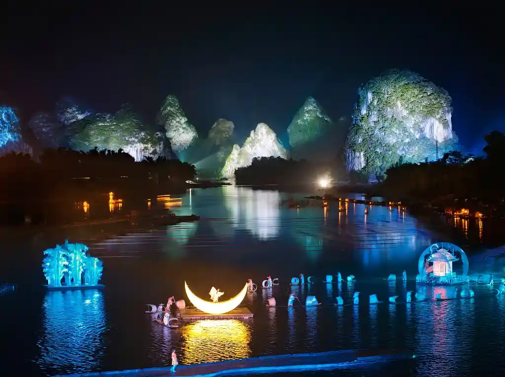 下午:返回桂林市区(车程约120分钟),赠送价值198元大型玄幻灯光歌舞秀——山水间(游览约60分钟)《山水间》是以桂林地域文化为根脉,将桂林群峰之形、秀水之态、人物之色、田园之美、神仙之奇和生活之趣揉入跌宕起伏的剧情,以神奇玄幻的艺术表现手法为观众打造全景视听体验,是桂林四大演出之一。