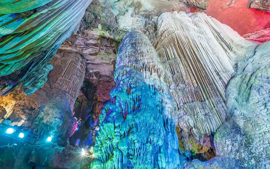 参观游览溶洞经典之作。洞内景象壮丽、五光十色,各种天然钟乳石晶莹剔透、洁白无瑕,形象栩栩如生,宛如夜空的银河倾斜而下,闪烁出像银子、似钻石的光芒,所以称为“银子岩”,号称“桂林最美溶洞”。