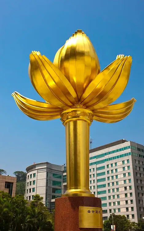 金莲花广场是澳门回归祖国时由中国国务院赠送的大型铸铜贴金雕塑“盛世 莲花”。