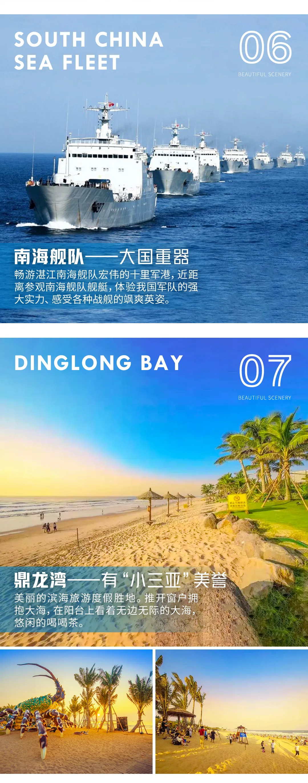 后乘坐“湛江八景之一”港湾览胜 【红嘴鸥游船】(必消景交船票),畅游有香港“维多利亚港”之称的湛江港湾精华段,伴您“港湾揽胜”欣赏【南海舰队十里军港】,近距离眺望赴亚丁湾执行护航任务的军舰,感受南海舰队强大军力及各类军舰的飒爽英姿,更可欣赏两岸城市风光海面碧蓝如玉、波澜不兴,渔帆点点、巨轮争流,海鸟掠浪飞翔。