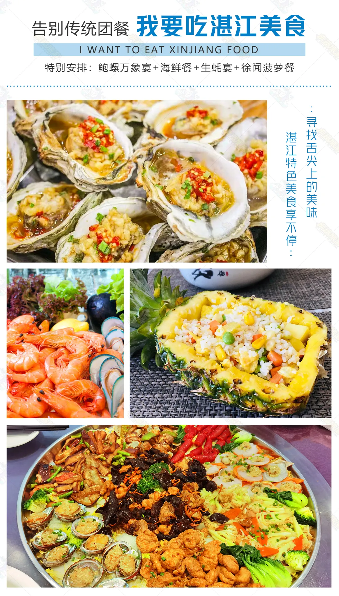 【用餐】全程包含7早4正(正餐餐标40元/人,特色餐:海鲜餐+生蚝宴+菠萝宴+鲍螺万象宴,必消套餐内含),如因客人自身原因不用,费用不退;