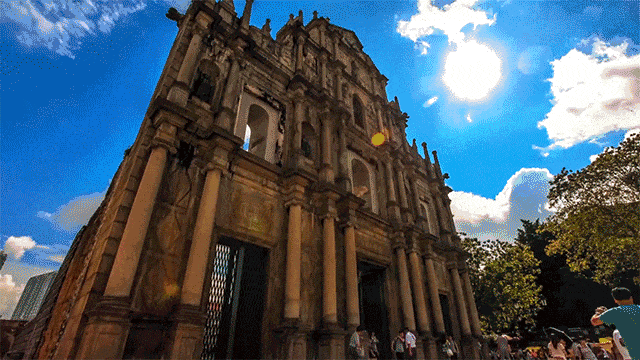 --游览【大三巴牌坊】大三巴牌坊是天主之母教堂(即圣保禄教堂)正面前壁的遗址。这座中西合璧的石壁在全世界的天主教教堂中是独一无二的。