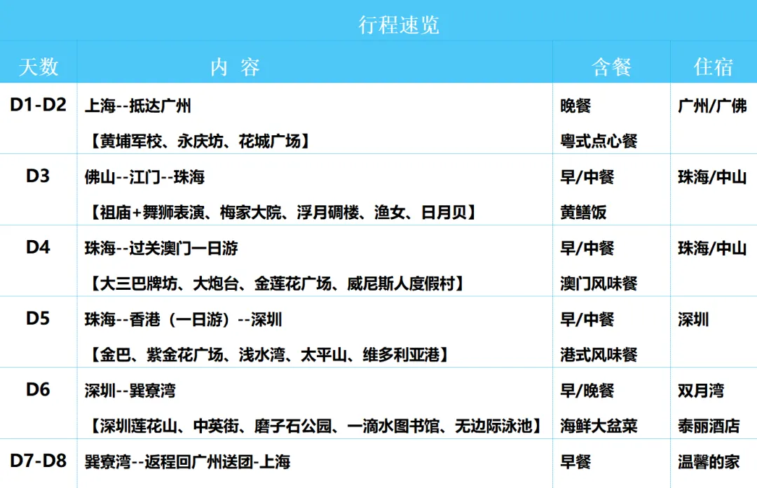 1.交通:上海至广州往返卧铺,全程正规空调旅游大巴车,每人一正座。