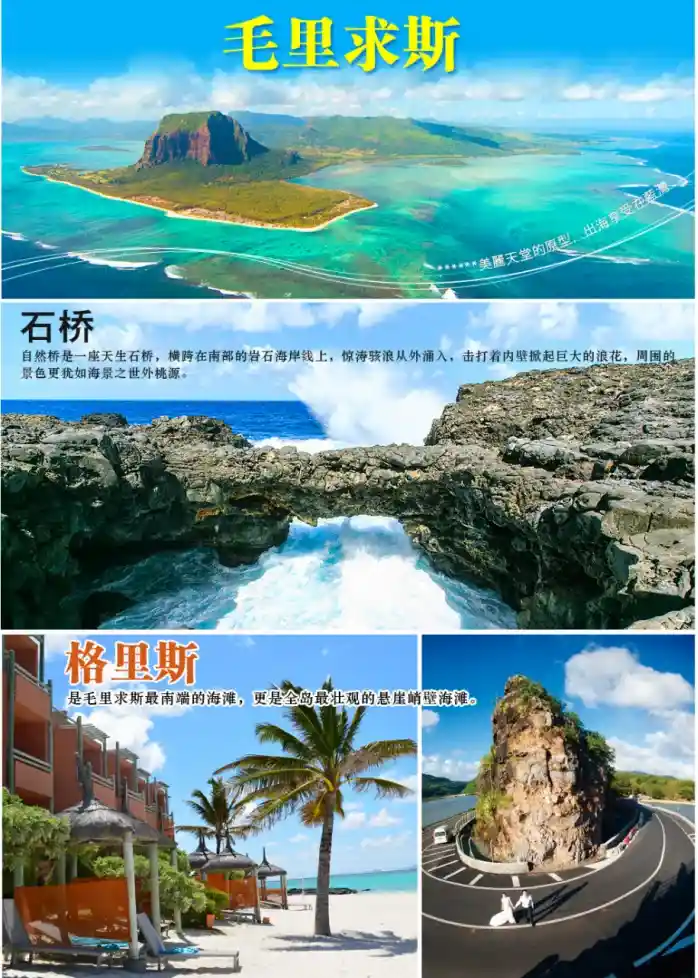 早餐后前往天涯海角,它是毛岛探入南印度洋的小角,沿海公路在此处形成一个非常妙曼的“U”型弯。沿台阶登上小小的观海平台,凭海临风,无限惬意。随后到达格里斯,是毛里求斯最南端的海滩,更是全岛最壮观的悬崖峭壁海滩。从格里斯海滩的平台还可以看到位于远一点的地方,悬崖的侧面,不断的挤压给人的印象是悬崖在哭。这个地方非常受欢迎,但同时也要注意自身的安全。然而格里斯是一个良好的视觉放松的地方。结束后驱车前往泥间小径,两边一片一片的甘蔗田、越过森林,眼前的景象深深地将您的心都迷住了。接着前往鹿岛码头,乘坐快艇抵达鹿岛,享用BBQ午餐(含)之后在美丽的鹿岛享受美妙的自由时光。这里被誉为毛里求斯群岛中最清澈美丽的水域,世界上最浪漫的度假胜地之一。