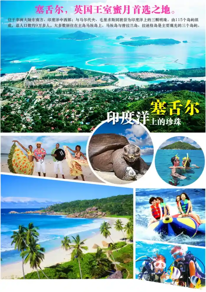 今日浦东机场集合办理登机手续,搭乘国际航班经转机飞往塞舌尔。融合非洲、欧洲、亚洲的影响,当地的艺术、音乐、建筑发展处独一无二风格,在其他地方是见不到的。一年四季,任何时候都可前往。英国王室蜜月的首选地。被评为全球最受欢迎的热带岛屿之一,也是世界最奢华的度假胜地