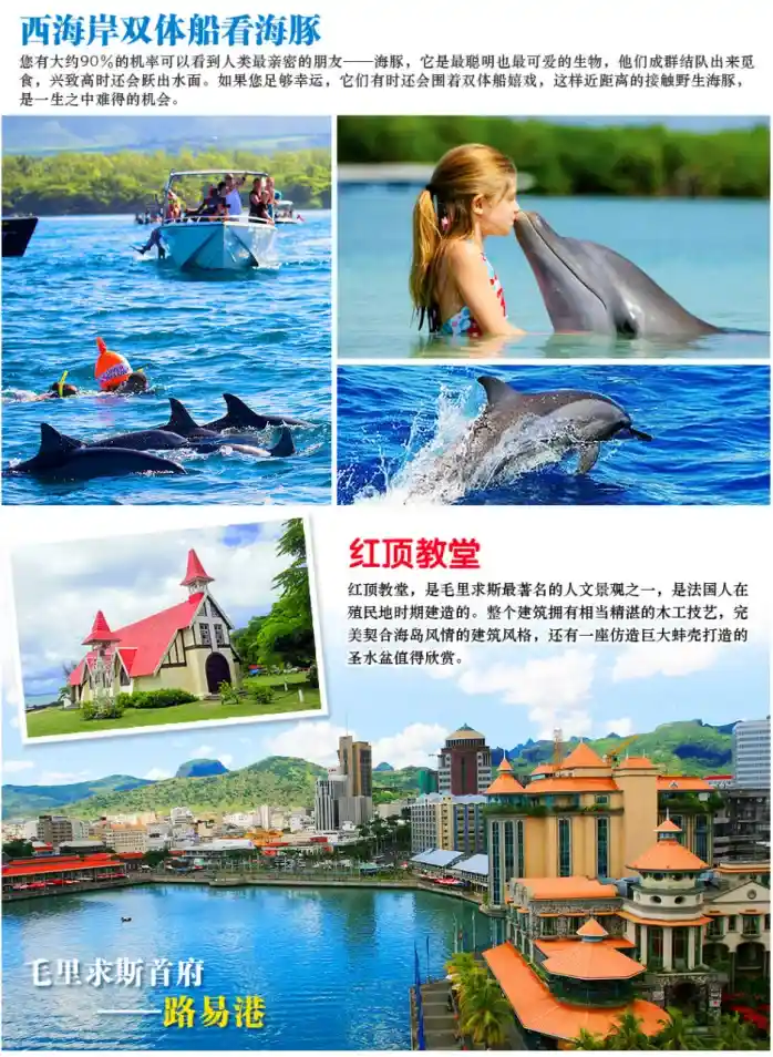早餐后前往码头登船,开始快艇巡游,畅游在平静的海洋中,海水的颜色会随着阳光的折射和海的深浅呈现出不同的色泽,非常美丽。您可以安静地晒晒太阳,您有大约90%的机率可以看到人类最亲密的朋友——海豚,它是最聪明也最可爱的生物,他们成群结队出来觅食,兴致高时还会跃出水面。2小时后返回车内,接着参观北部红顶教堂,整个建筑拥有相当精湛的木工技艺,完美契合海岛风情的建筑风格,还有一座仿造巨大蚌壳打造的圣水盆值得欣赏。白墙红顶的教堂掩映在无垠绿野之中,呼之欲出的碧海蓝天,是最佳的取景地点。之后参观炮台山,在山顶可俯瞰整个路易港市容。山上堡垒名为阿德莱伊德城堡(Fort Adelaide),建于1834-1840年间,城堡名称源自当时英国国王纪尧姆四世之妻的名字,修建的主要目的是预防当时旨在推翻奴隶制度的反抗运动。最后到达路易港蔻丹广场,广场中心有一片用五颜六色的雨伞搭起来的区域,很多游客都会在这里拍照,雨伞街也是蔻丹广场,甚至毛里求斯的代表景色。