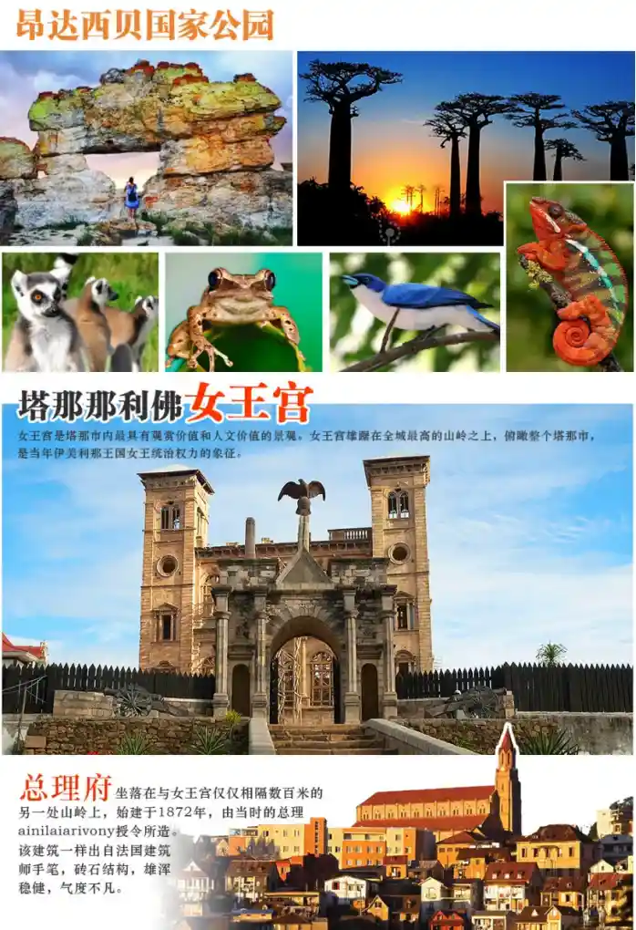 第11天:圣但尼(港口观光)塔那那利佛(马达加斯加) 参考航班:UU611 1440/1515或MD191 1340/1500(周3)(为配后续航班,此天航班有可能会提前一天飞)