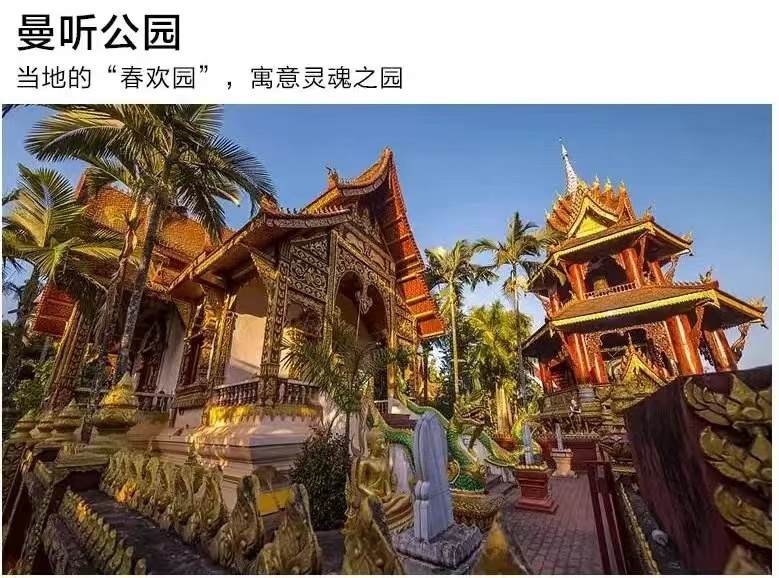 【野象谷景区】游览 (游览时120分钟左右):这里是中国野生亚洲象保护地,中国唯一一处能近距离安全观测到亚洲野象地方,这里有中国最长的高空观象走廊、中国唯一的亚洲象博物馆、有着最权威的亚洲象种源繁育及救助中心,以及中国最早的亚洲象学校。。午餐赠送特色象餐;乘车至傣王的御花园---【曼听公园】,(电瓶车40元/人自理)曼听公园是西双版纳最古老的公园,已有1300多年的历史,过去是西双版纳傣王的御花园,在傣族历史上曾为封建领主召片领和土司们游玩赏花之所。传说傣王妃来公署游玩时,公署的美丽景色吸引了王妃的灵魂,因此取名春欢公园,傣意为“灵魂之园”。参观圣洁的曼飞龙笋塔,总佛寺,八角亭,周恩来总理参加泼水的全身铜像。晚上可自费280元/人参加.篝火晚会;后入住酒店。