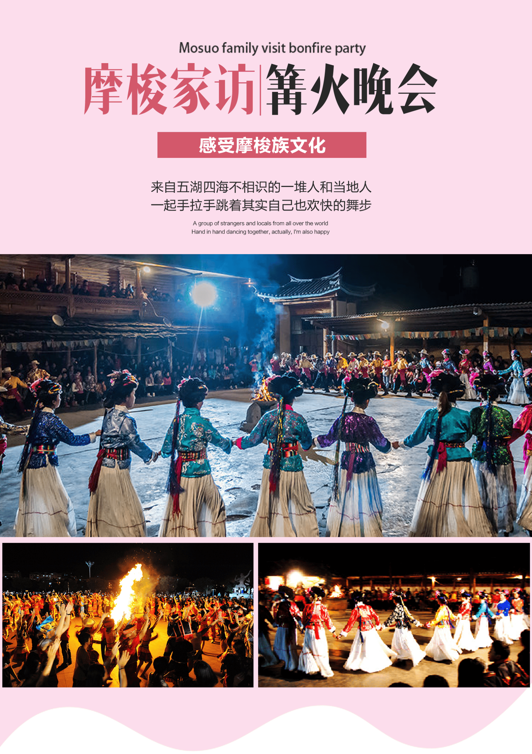 第一站抵达【里格观景台】,在观景台您可以看到泸沽湖全貌,它已经等您几亿年了,欣赏风景如画的泸沽湖全景,乘【猪槽船】游览泸沽湖,在这里您不用拍照技术都能照最美的照片,参观完泸沽湖风景后,我们热情的摩梭人民,拿出招待贵宾用的【摩梭走婚宴】,用它来招待远方来的贵客们,酒足饭饱后,您可以参加摩梭人民举行的盛大的【篝火晚会】,泸沽湖是女儿国,又是歌舞的王国。泸沽湖畔的摩梭村寨,每晚都要举行篝火晚会,您可以和帅气的摩梭小伙子、美丽的摩梭姑娘一起,围着篝火跳起欢乐的舞蹈!然后入住酒店休息!