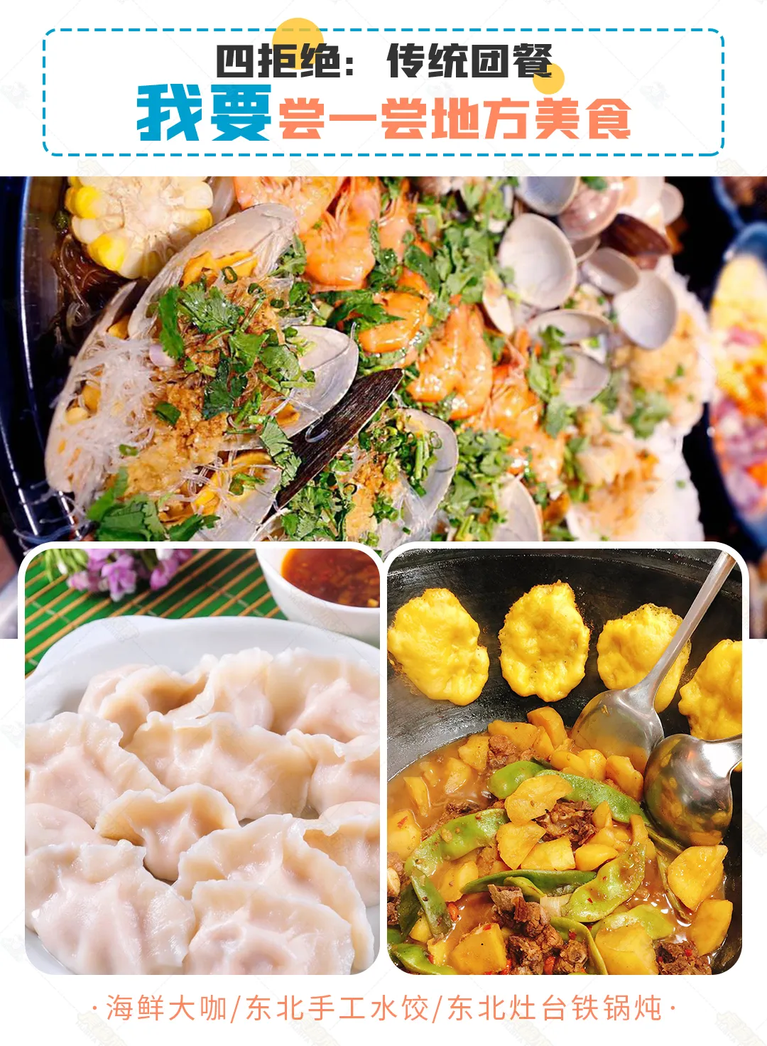 【用 餐】全程含餐3正4早(餐标:30元/人,特色餐:东北手工水饺+东北特色铁锅炖+海鲜大咖,并赠送海参捞饭每人一份),如因客人自身原因不用,费用不退;