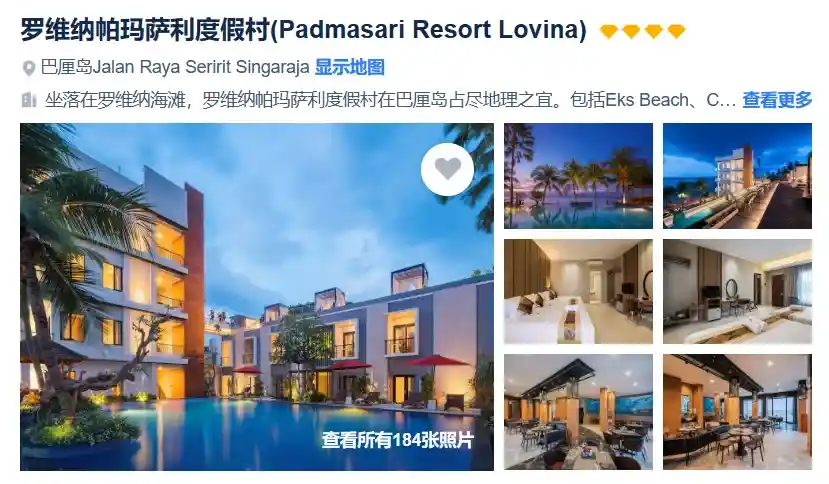 宿:Sunari Lovina/Padmasari Resort Lovina/Brits Resort Lovina(4钻酒店)