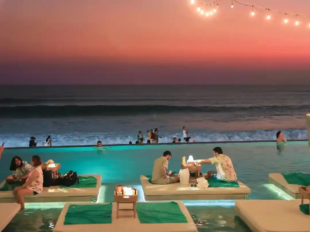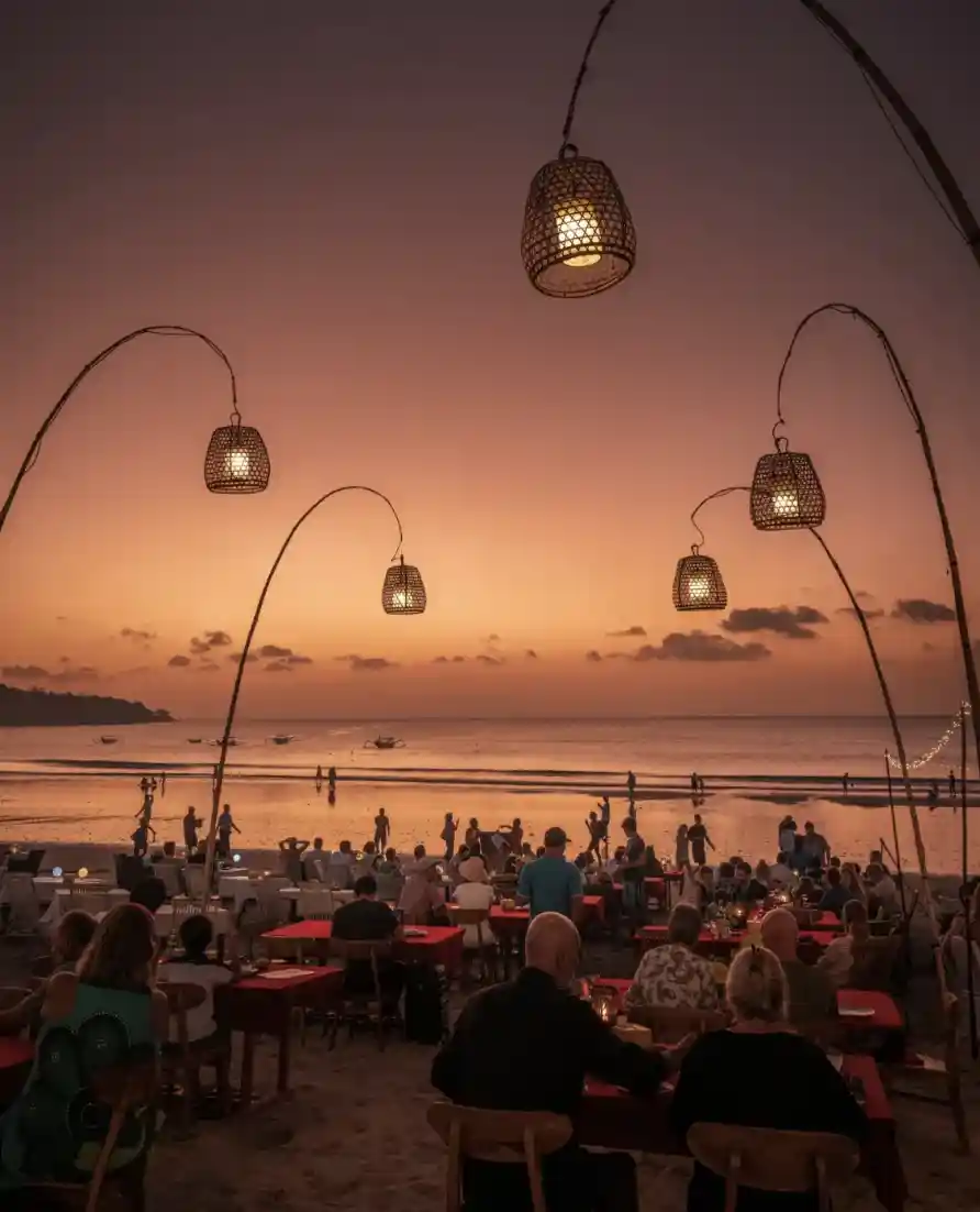 17:00--来到【金巴兰海滩观日落+沙滩BBQ晚餐】夕阳下、烛光中、悠扬的印尼民歌、金巴兰海滩的魅力是无法令人抗拒的。海景落日、沙滩、歌手民谣、美食、点点烛光,无限浪漫。把巴厘岛旅游带入一个新的境界。亦或找一把椅子,舒适的靠着,看着夕阳西下。看着周围追逐海浪的游人,不论是感叹岁月的流逝,或是静静的发呆,都是不错的。如若你旁边正好坐着你的那个TA,那么,唱一首俗边大江南北的《最浪漫的事》那也是醉了呢。此时宜表白,求婚等等……一边欣赏落日美景一边享用沙滩美味BBQ烧烤餐,绝对让你感觉无比浪漫和惬意。